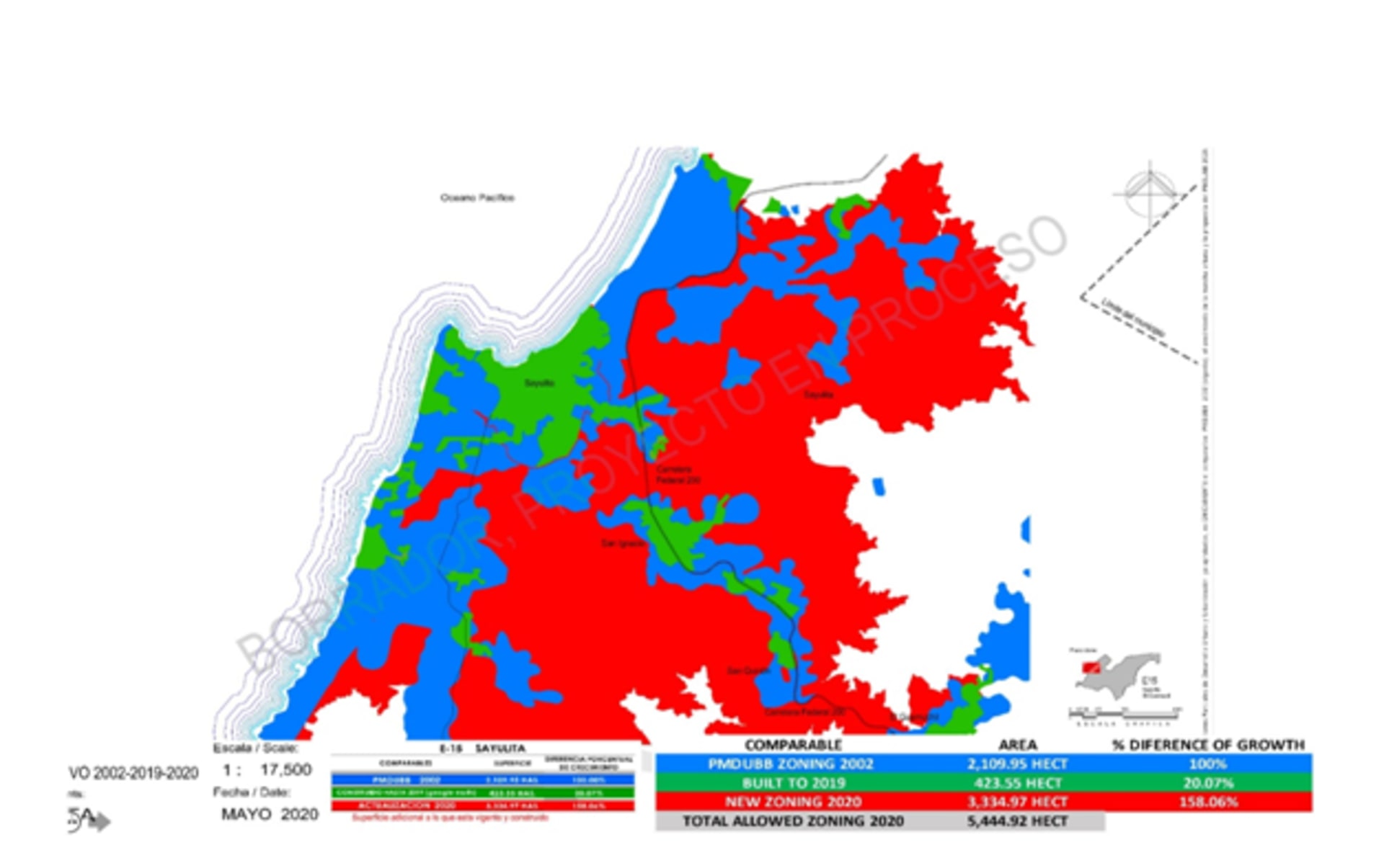 The 2020 IMPLAN would have increased density in Sayulita by 787% from what is currently built. It would allow structures of 7-9 stories on the beach front, from the 200 Hwy on the Punta de Mita Road to Revolucion and along the north end of Revolucion, roughly to where the bus station is currently located. In addition, the plan would allow for 7 stories on the south end of Revolucion as well.