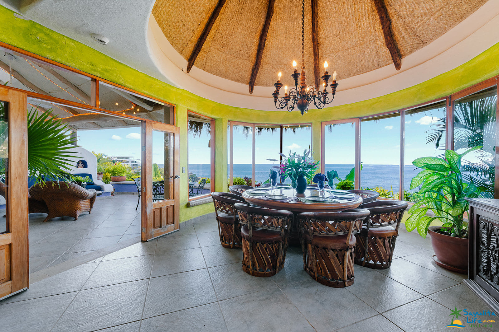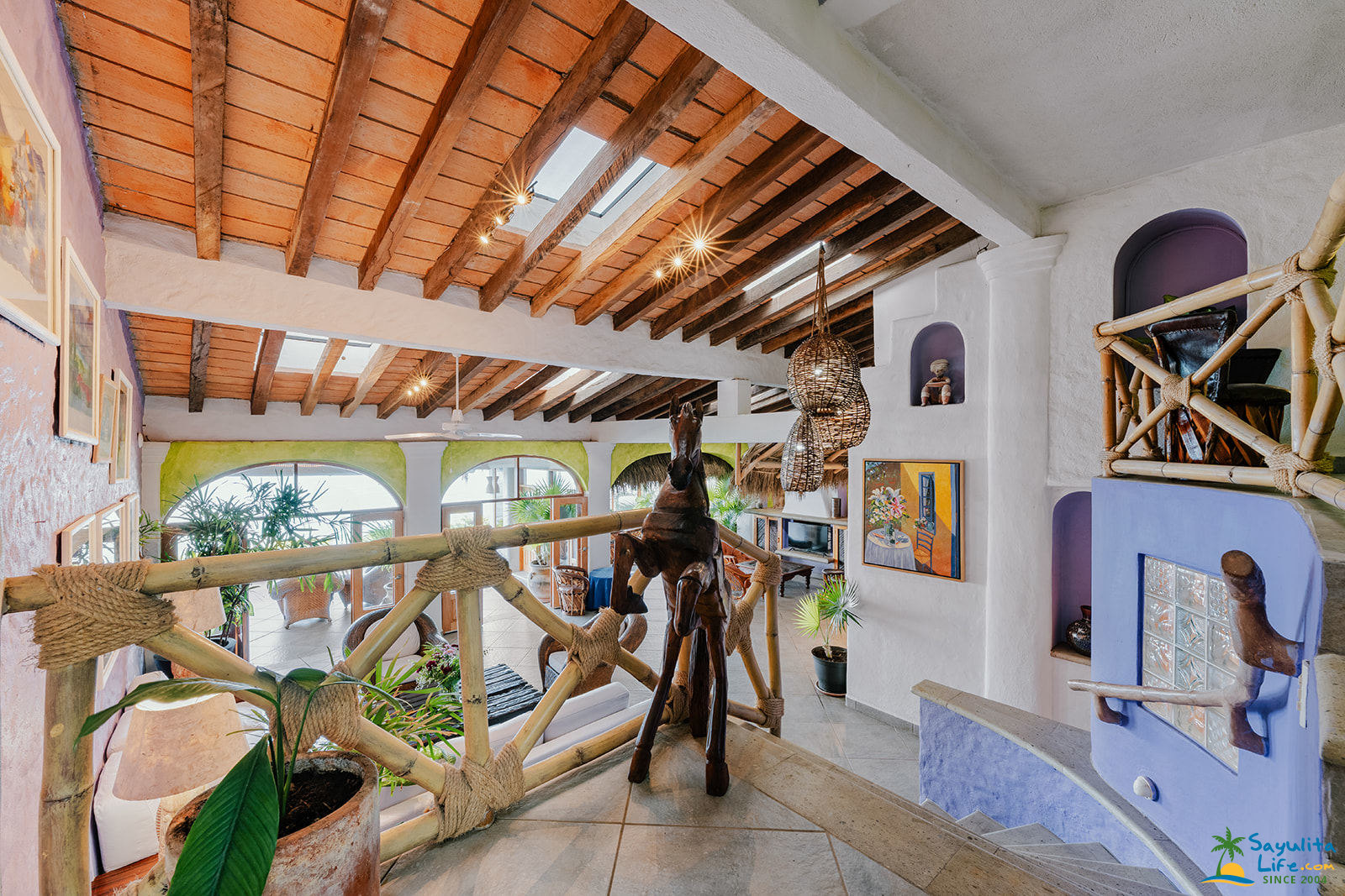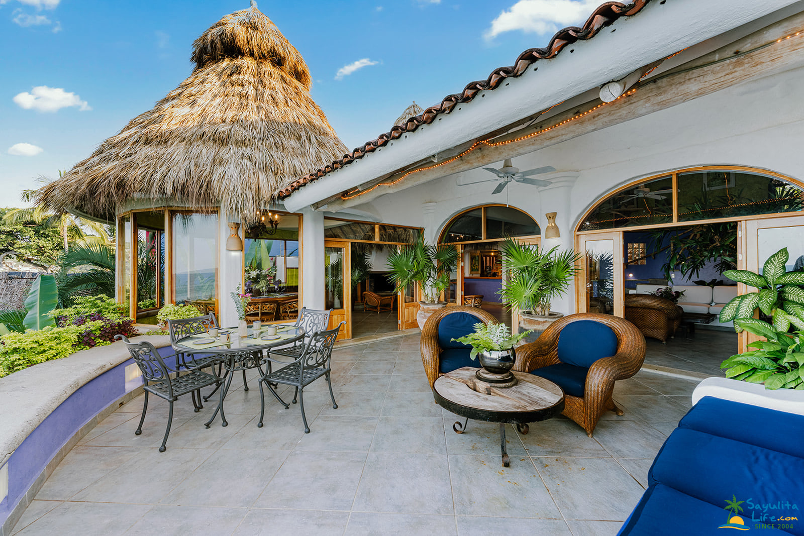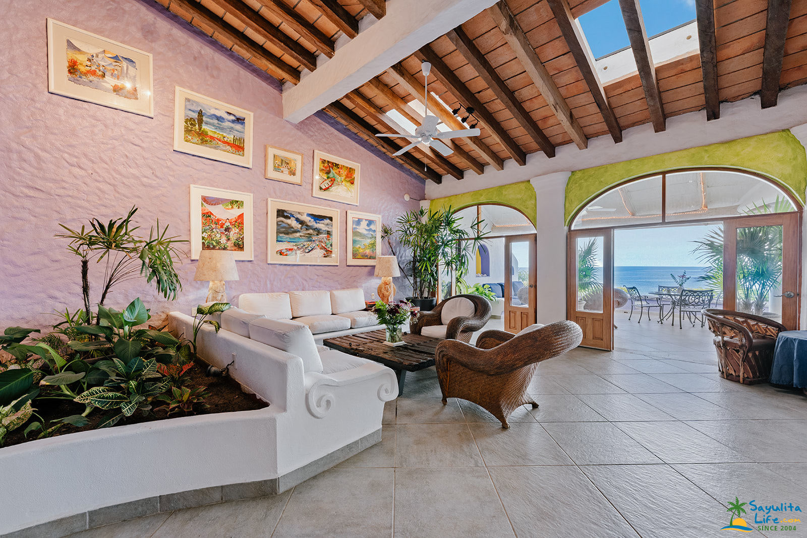 Enter through wrought iron gates and descend a sweeping stone staircase into a grand living room with soaring ceilings and original paintings by Evelyne Boren. Glass-paneled doors open to spacious terraces overlooking the Pacific and Sayulita’s surf break. The circular dining room, enclosed in glass, features a palm-thatched cone ceiling and seats 10. Enjoy al fresco dining on the terrace, where candlelight, moonlit skies, and the sound of waves set the scene.