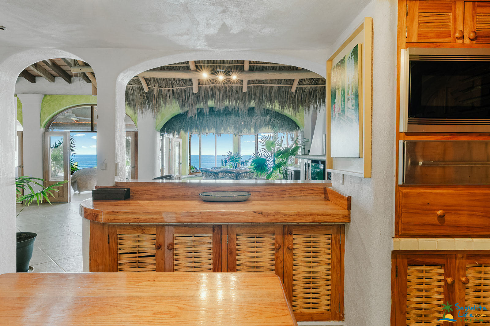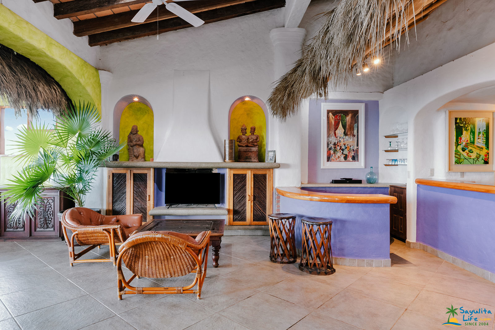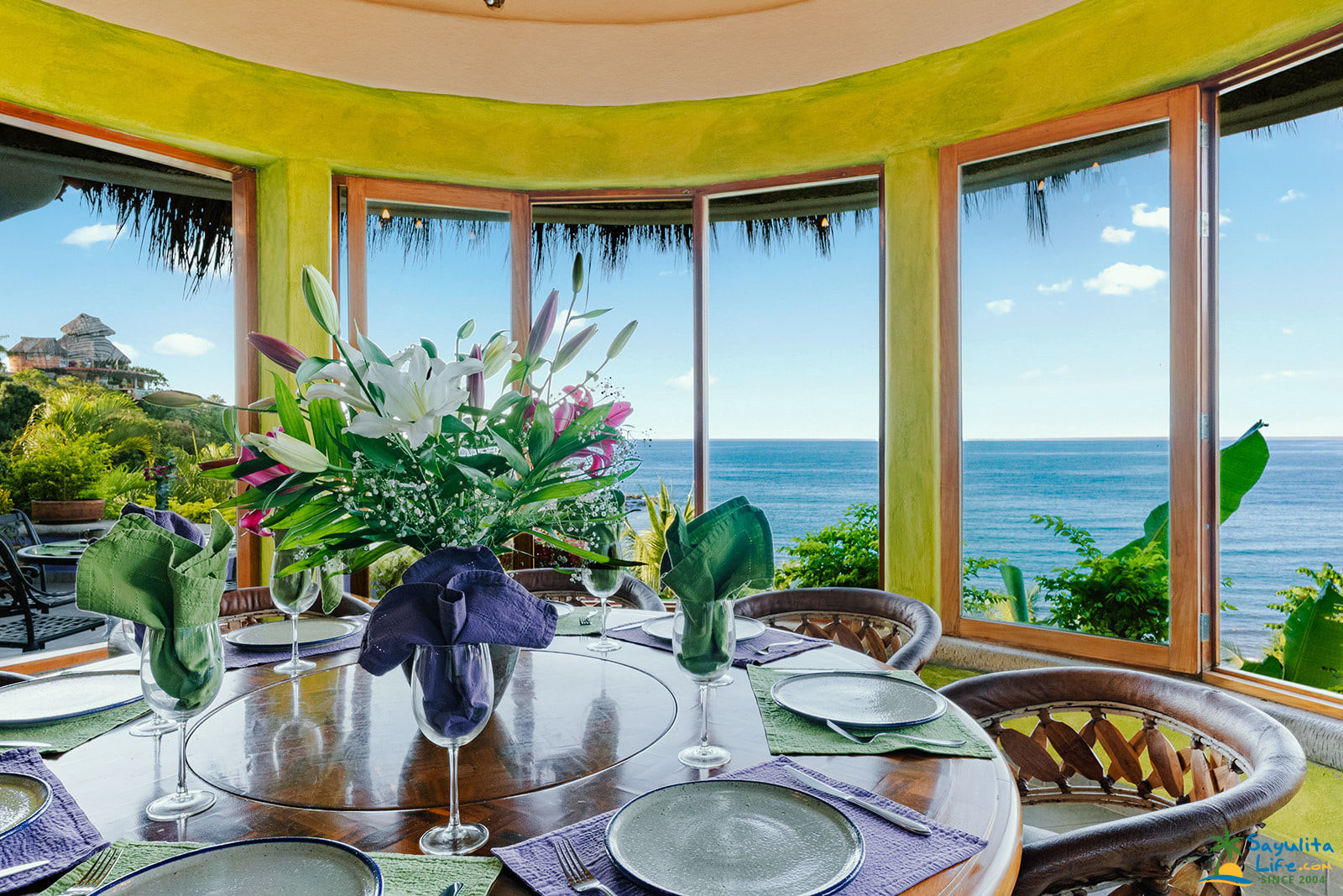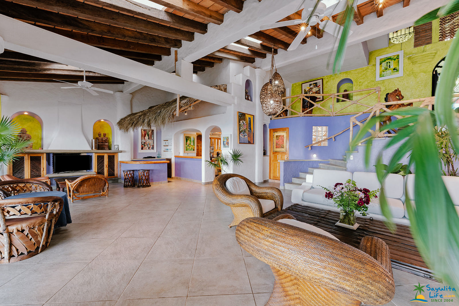 Enter through wrought iron gates and descend a sweeping stone staircase into a grand living room with soaring ceilings and original paintings by Evelyne Boren. Glass-paneled doors open to spacious terraces overlooking the Pacific and Sayulita’s surf break. The circular dining room, enclosed in glass, features a palm-thatched cone ceiling and seats 10. Enjoy al fresco dining on the terrace, where candlelight, moonlit skies, and the sound of waves set the scene.