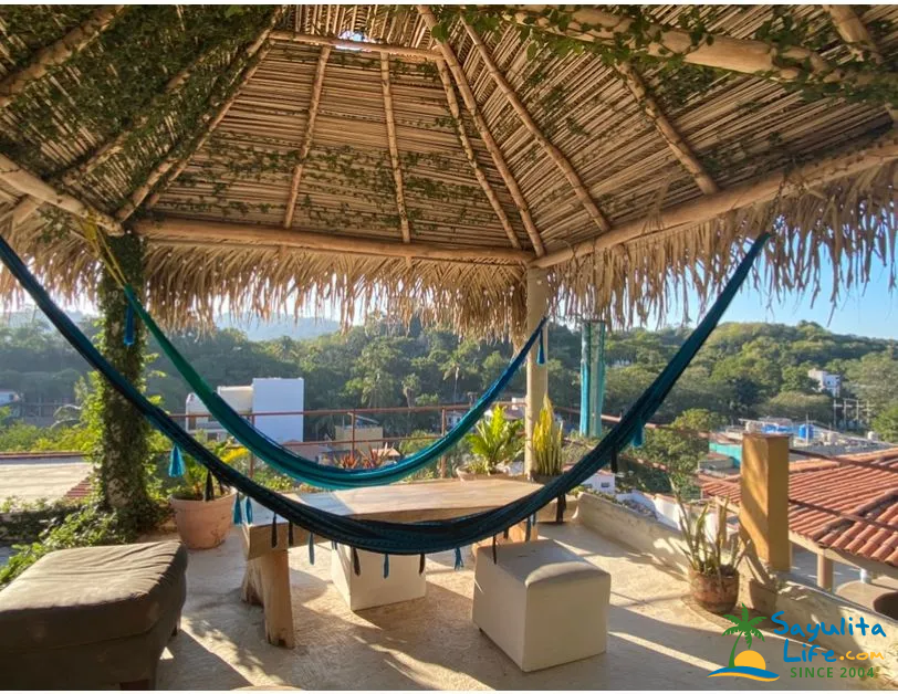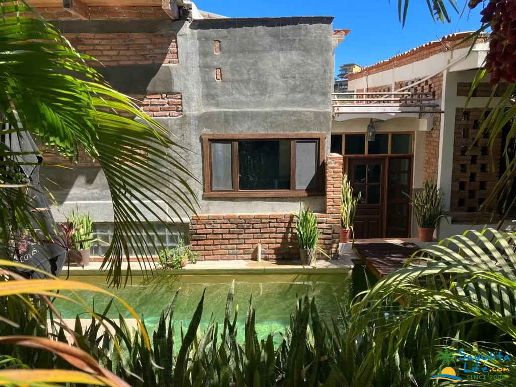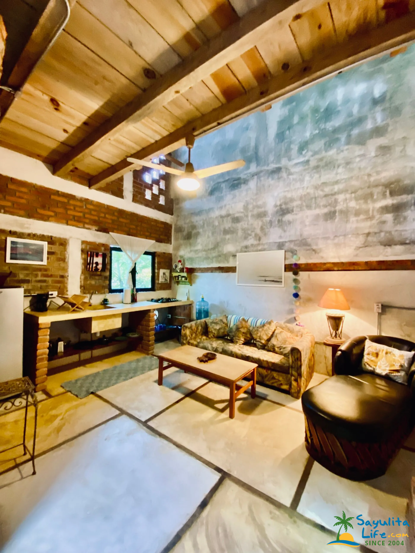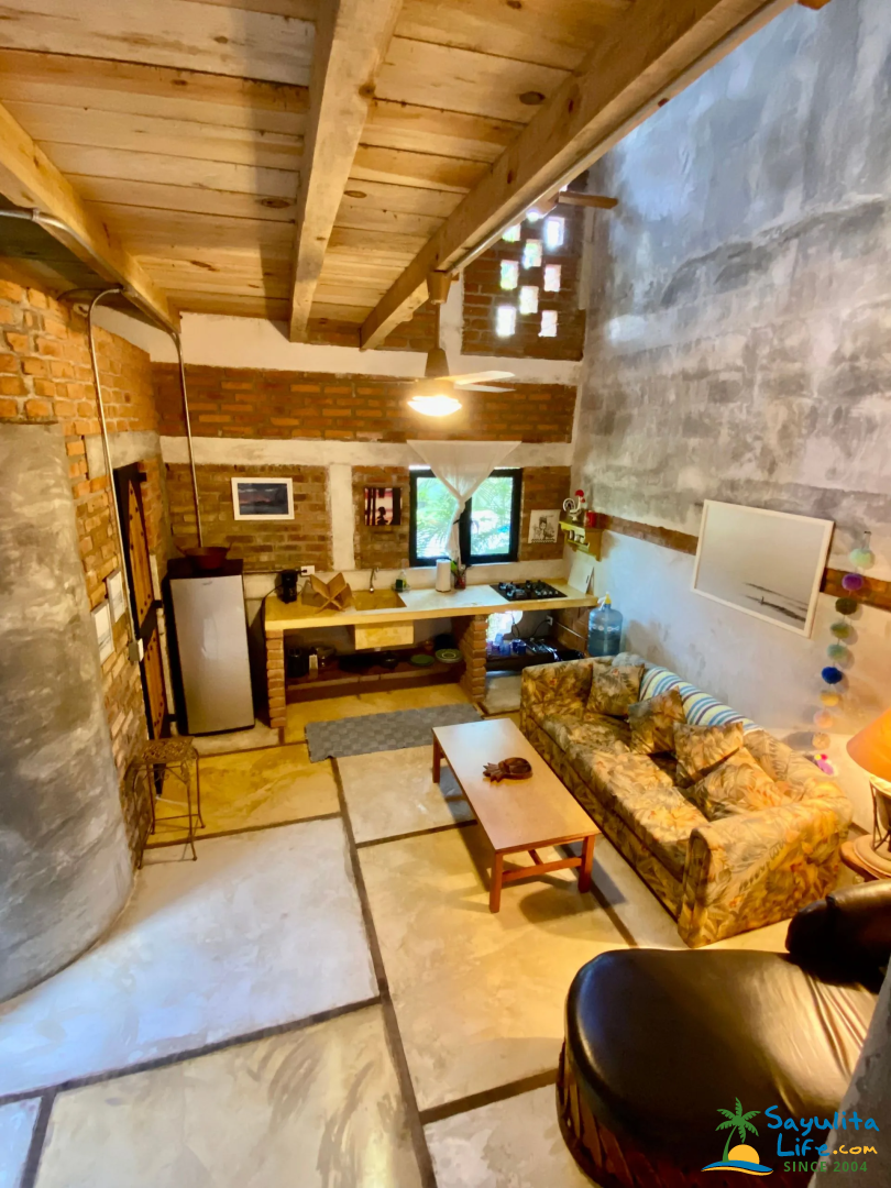 Set within the eclectic property of Casitas Eclécticas, this bungalow is one of eight uniquely designed units connected by winding pathways, staircases, terraces, and lush tropical landscaping. Located on the peaceful South Side of Sayulita, it offers a quiet escape from the downtown energy while remaining within easy walking distance of everything. The main beach and plaza are just a 10-minute walk away, along with small grocery stores, a tortilla factory, flower shops, and cozy cafés.