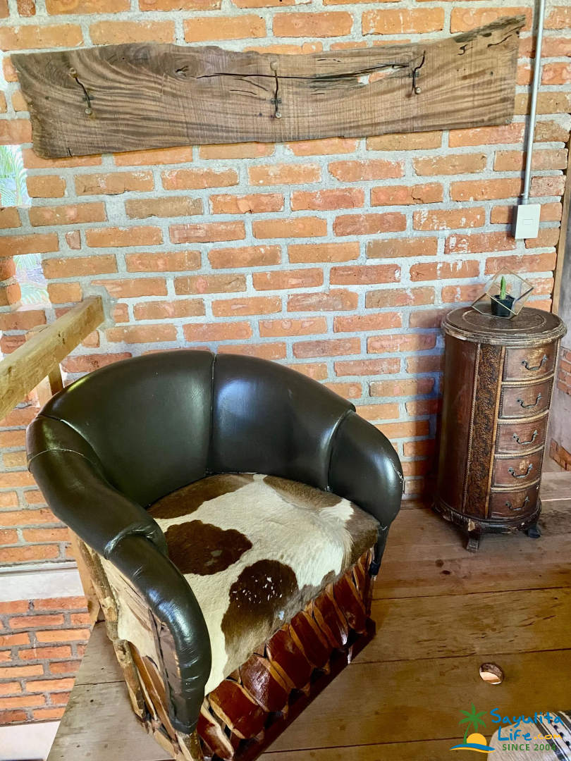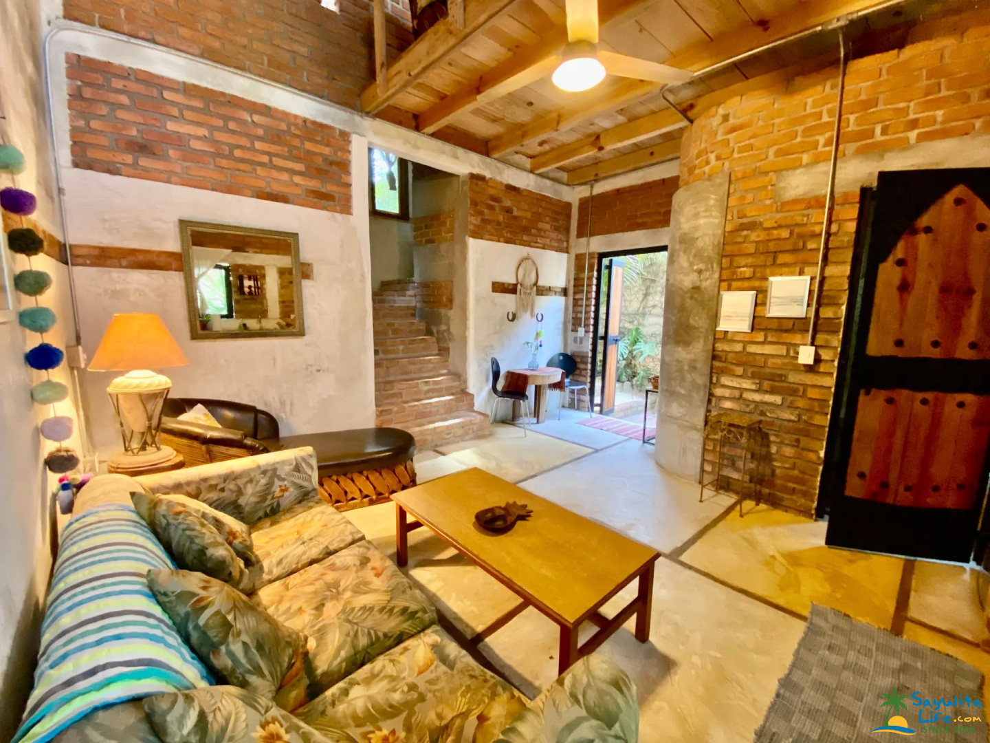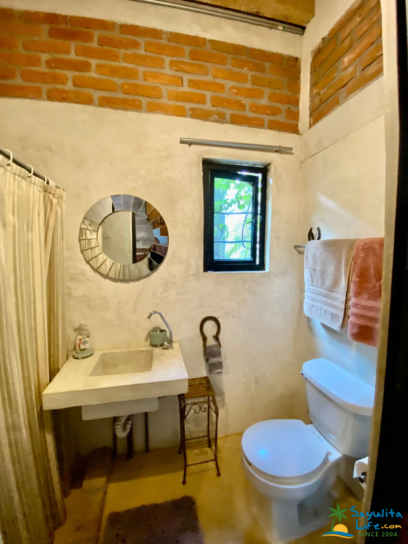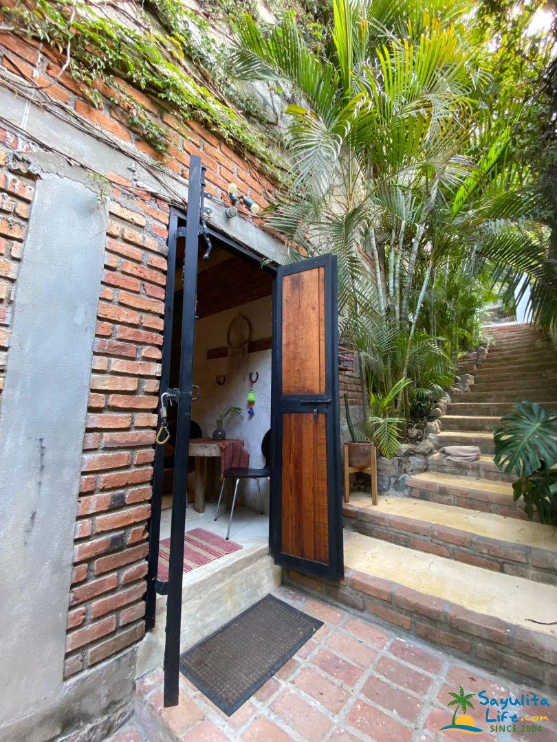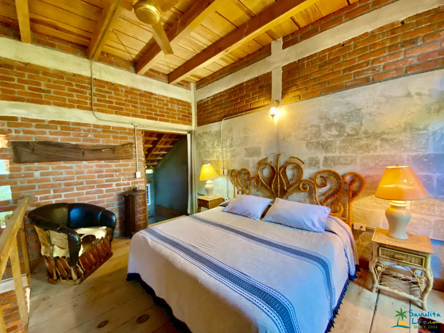 Up the brick staircase, the second-floor bedroom features a comfortable king-sized bed with quality linens and a beautiful Mexican-style bedspread. Just outside, a private balcony opens to the surrounding greenery, where you can enjoy the tropical sounds and rhythm of life in Sayulita.