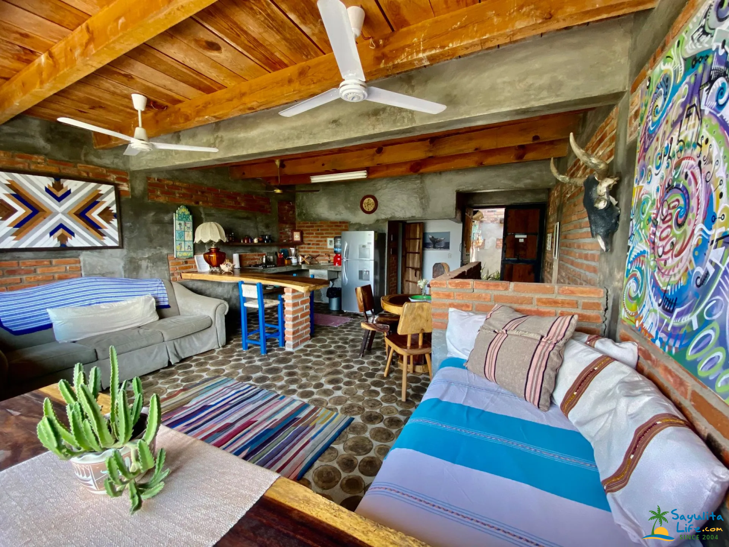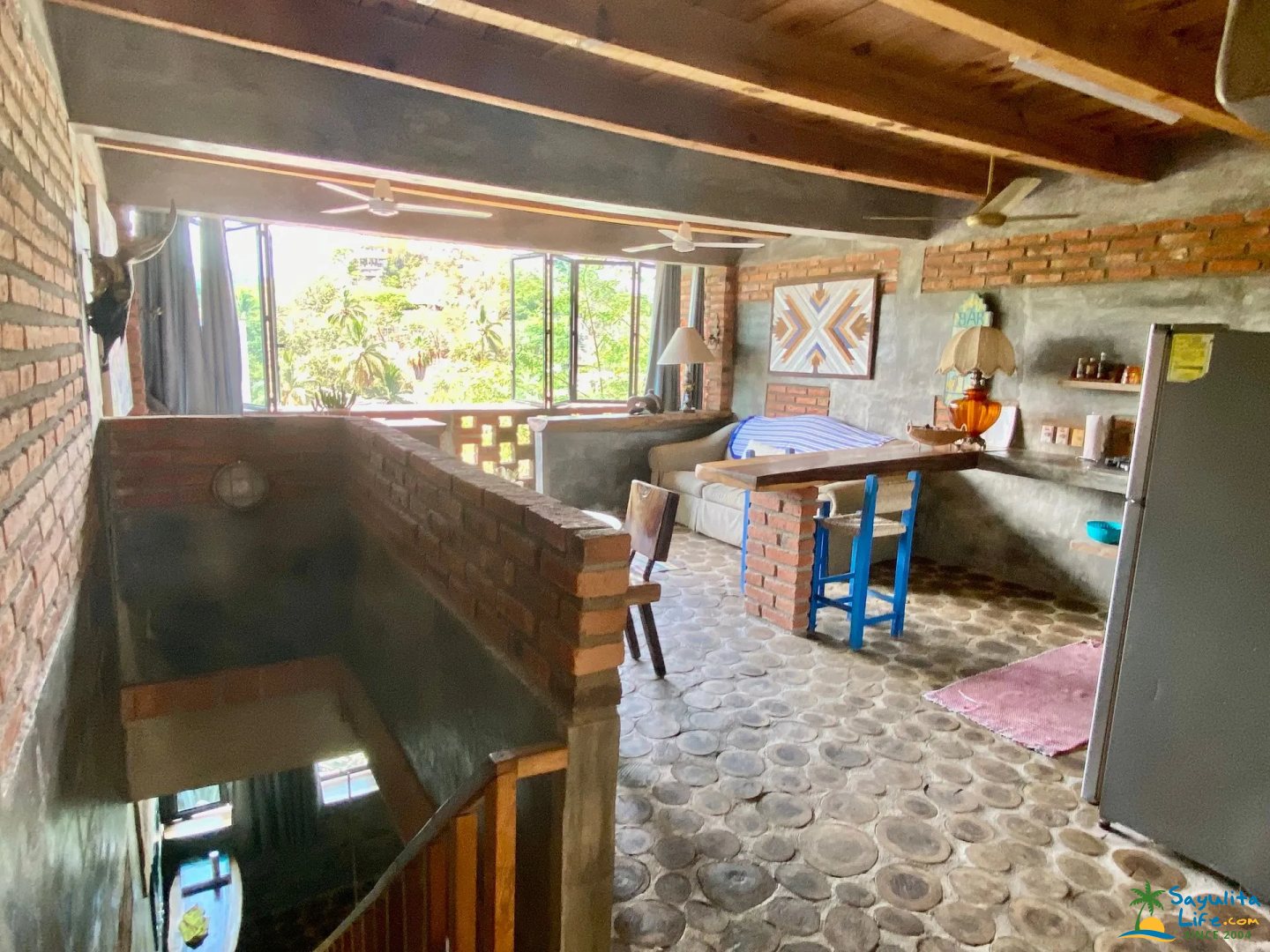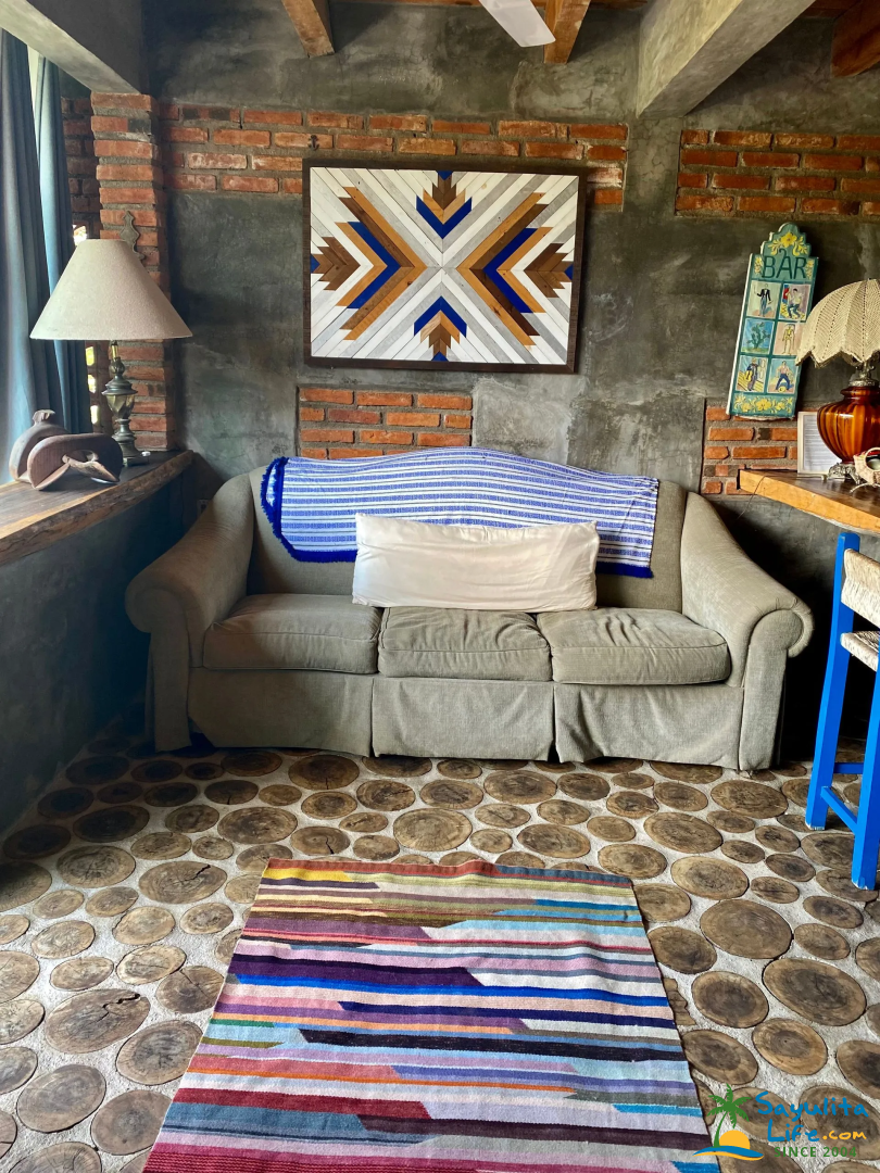 Set within the eclectic property of Casitas Eclécticas, this unit is one of eight uniquely designed casitas connected by winding pathways, staircases, terraces, and lush tropical greenery. Located on the peaceful South Side of Sayulita, it offers a quiet escape from the downtown energy while remaining within easy walking distance of everything. The main beach and plaza are just a 10-minute walk away, along with small grocery stores, a tortilla factory, flower shops, and cozy cafés.