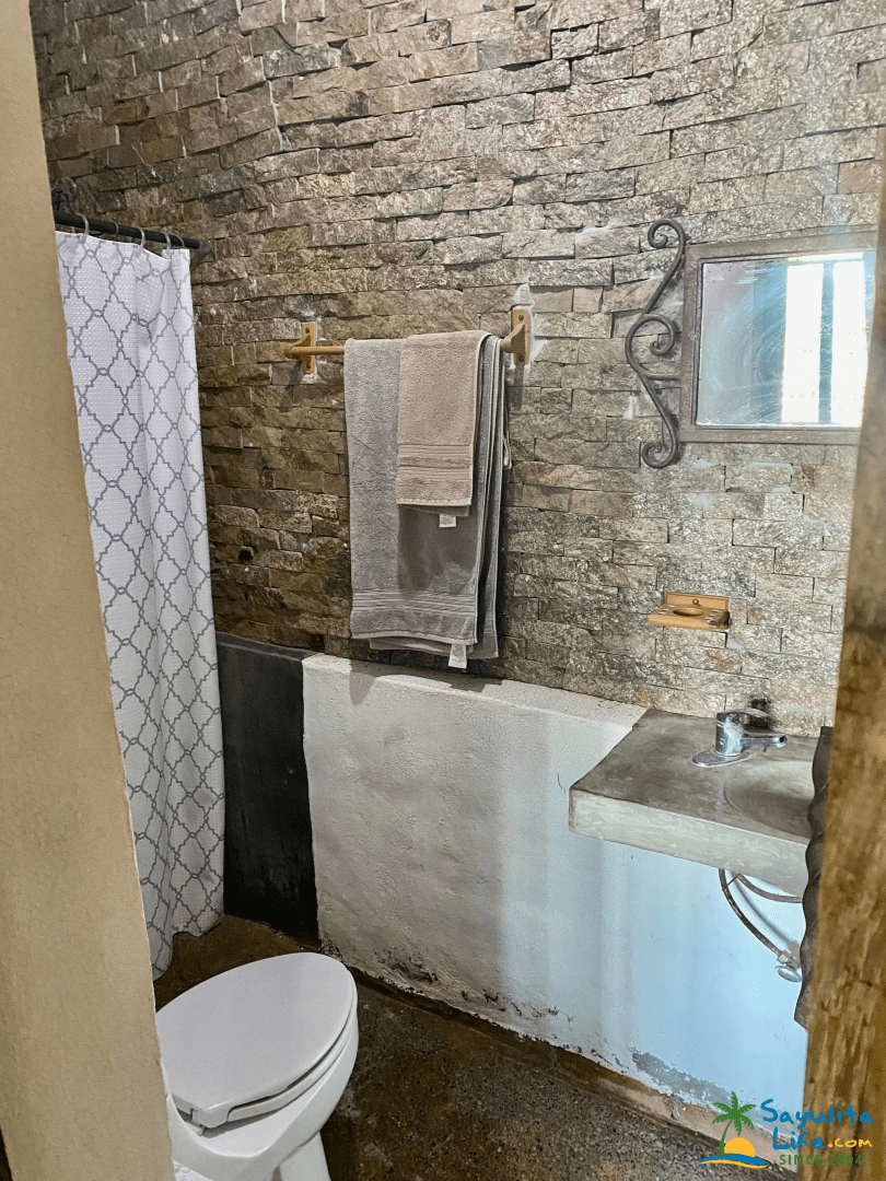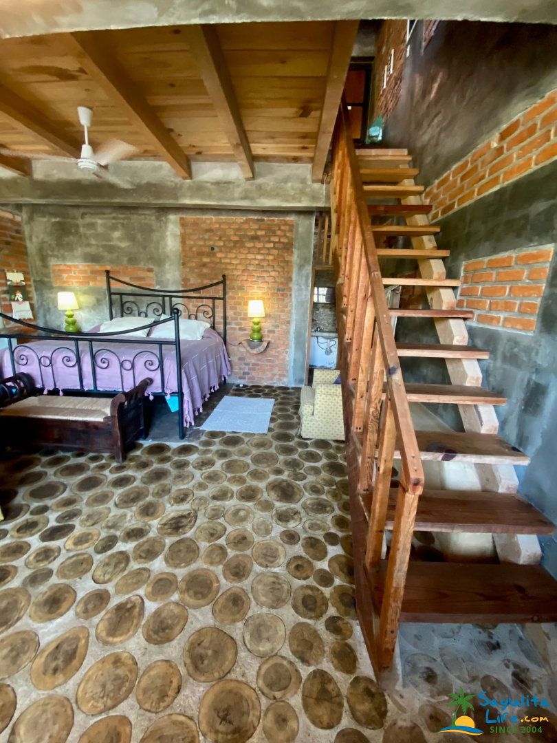 Upstairs, wooden stairs lead to a private bedroom and a second full bathroom, creating separation and added comfort for guests. With two full bathrooms in total, the casita is especially convenient for couples or small groups.