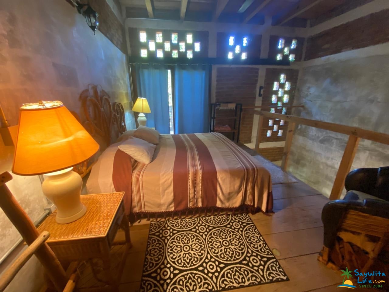Up the brick staircase, the second-floor bedroom welcomes you with a comfortable king-sized bed, quality linens, and a beautiful Mexican-style bedspread. Just outside, a private balcony opens to the lush surroundings, where you can enjoy the tropical sounds and rhythm of daily life in Sayulita.