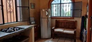 The Terrace Bungalow which rents for $100 USD per night-1-2 persons This unit is located on the second level and accommodates 2 people . Floor to ceiling wrought iron glassed-in doors and windows surround the unit and these can be opened to balconies on two sides, affording guests a view overlooking our entry garden and pool area, as well as local views of the pueblo,The kitchen has a refrigerator, stovetop , microwave, coffee maker, toaster. blender and all utensils. Our kitchen windows face east and morning sunrays make it bright and cheerful. Spacious French doors open onto a tree-shaded terrace allowing the cool ocean breezes to keep this unit a comfortable temperature. Two ceiling fans add to your comfort.The Terrace Bungalow offers a spacious bedroom with a queen size bed, two large closets with shelves and additional storage space. French doors open onto a private balcony overlooking our garden/pool area. Beautiful arched handmade wooden doors enhance the bedroom and bathroom, and connecting private entrances to the bath area make it convenient for all guests . High ceilings and ceiling fan provide comfort for sleeping , also has A/C