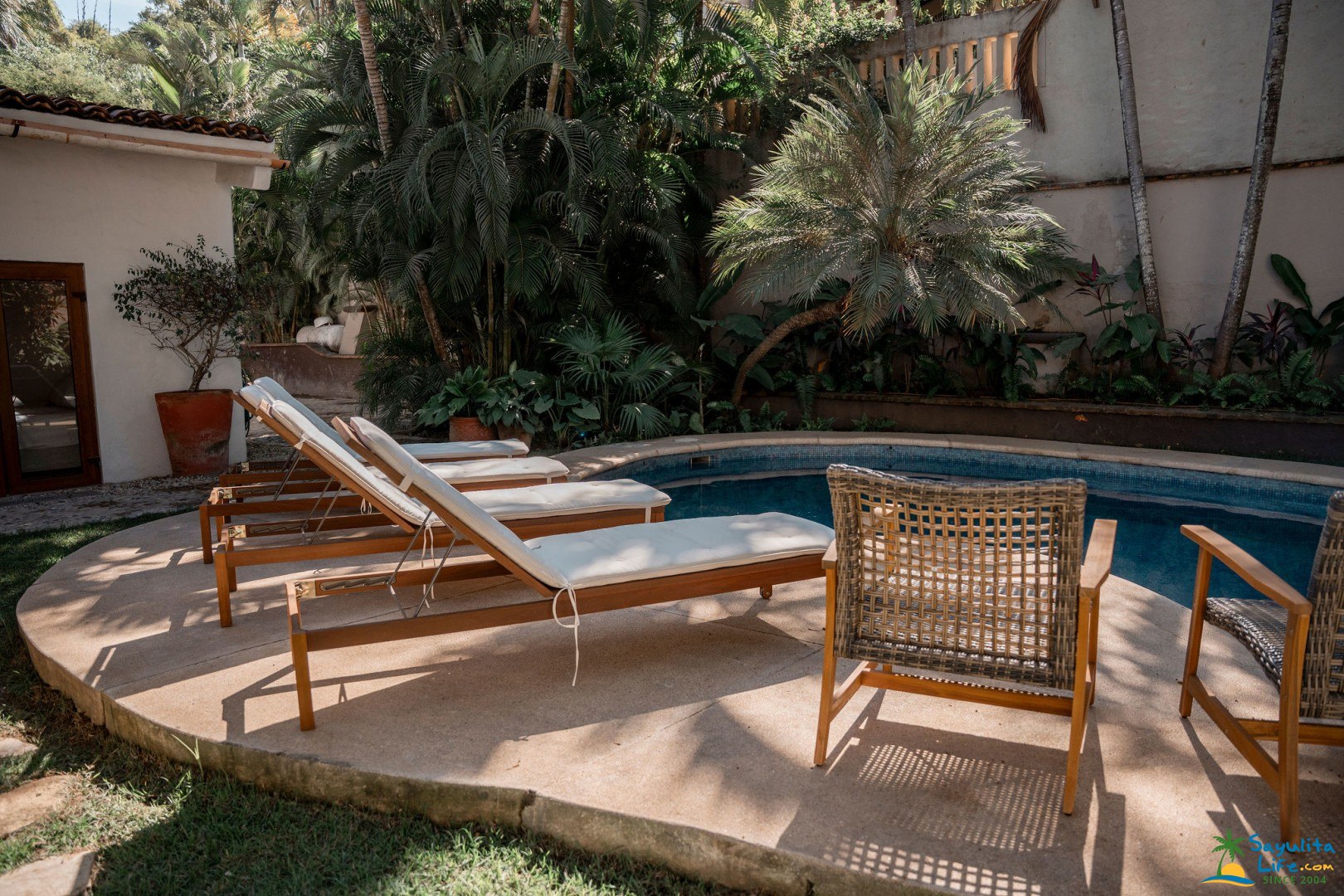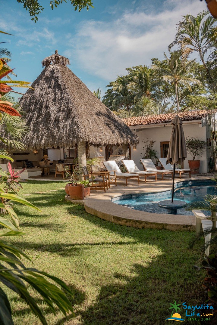 The location is less than one block from the beach, just north of the left surf break. This is a very quiet neighborhood with other elegant villas and vacation rental properties. Enter through two large gates which provide secure parking should you need it. The gates open up to the beautiful garden and pool area equipped with lounge chairs, umbrellas, and a large step in the pool to keep you cool. The grassy lawn is highlighted with lush tropical plants and flowers. If you are lucky, you might even be able to eat bananas directly from our trees. Being so close to the village and no hills mean you don't need a golf cart or rental car during your stay, as it is an easy walk to everything.