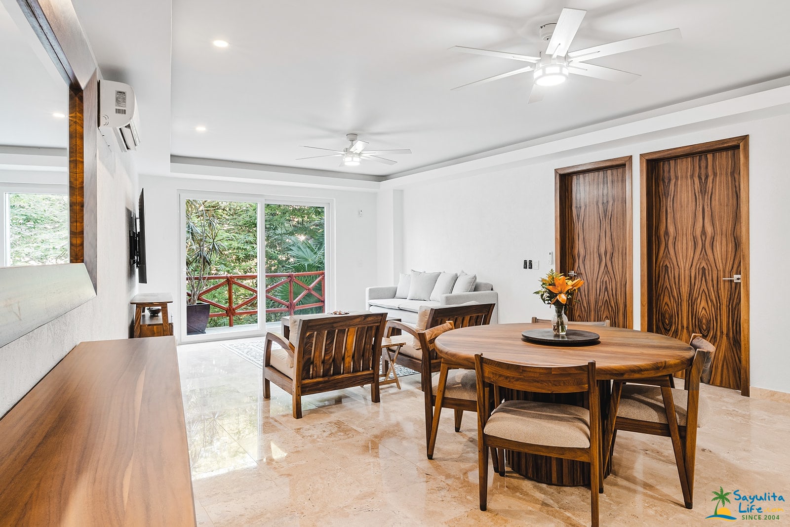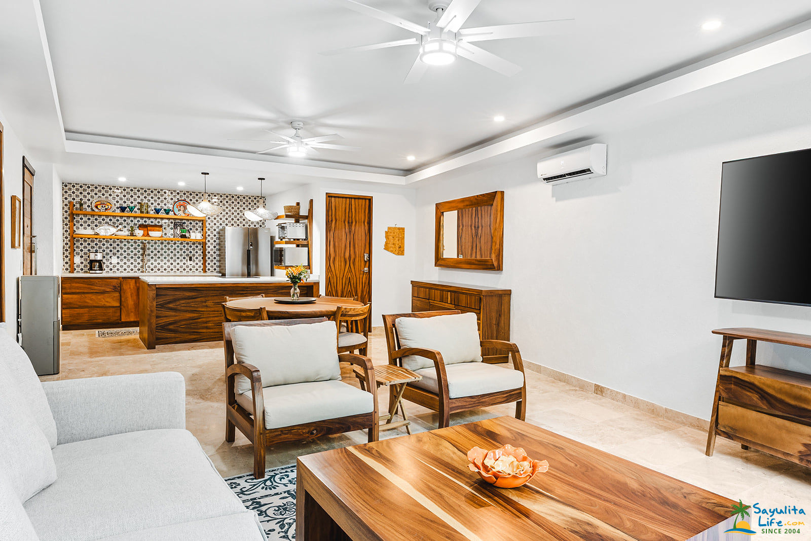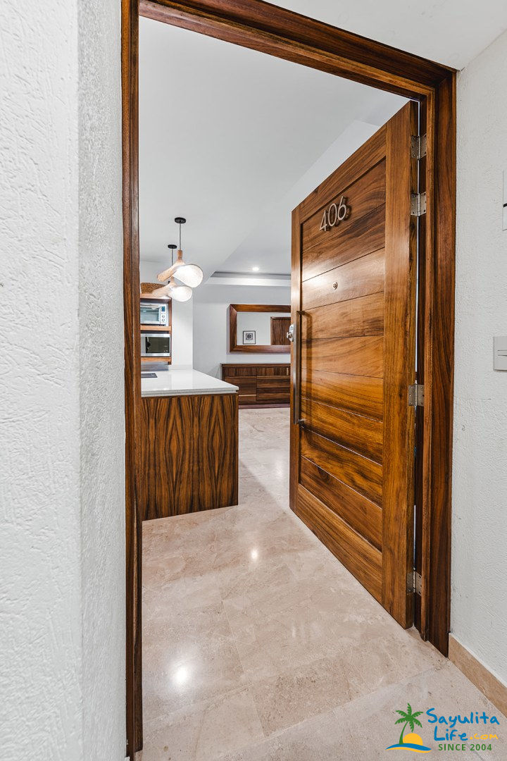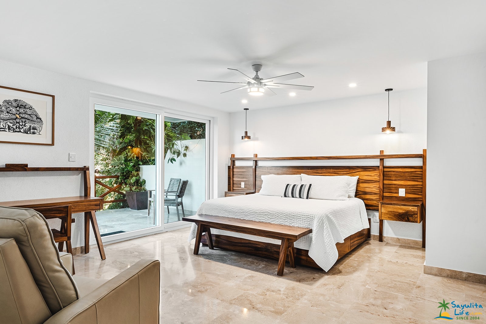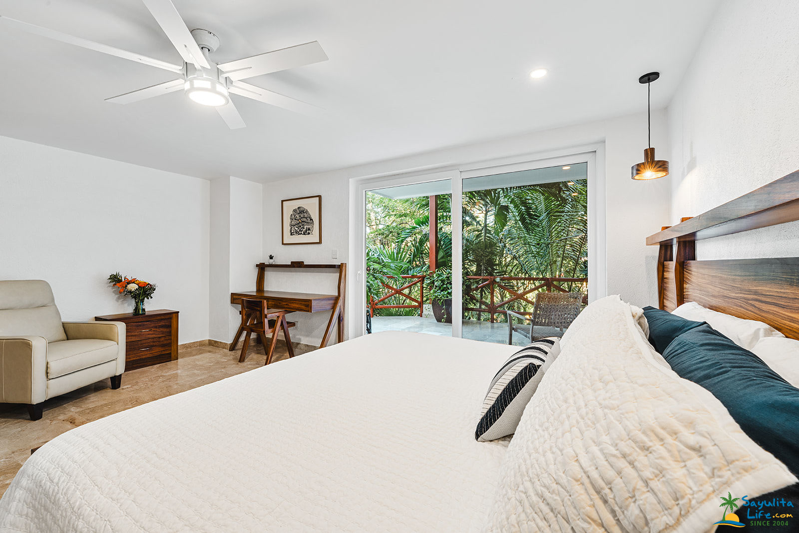 Pajaro 406 in Sayulita is a spacious and thoughtfully designed one-bedroom condo located within the Pájaro de Fuego complex, directly across from the beach on Sayulita’s peaceful north end. As the only one-bedroom residence in the development, it offers a tranquil and private stay surrounded by protected tropical jungle, where ocean sounds and tropical birds create a calming atmosphere.