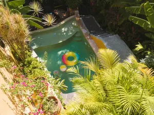 Outside, there is a large garden full of tropical foliage and a beautiful new saltwater pool. The infinity-edge pool has a relaxing shallow area for lounging and a waterfall that makes you feel immersed in nature. It is your own jungle paradise just minutes from the beach and center of town.
