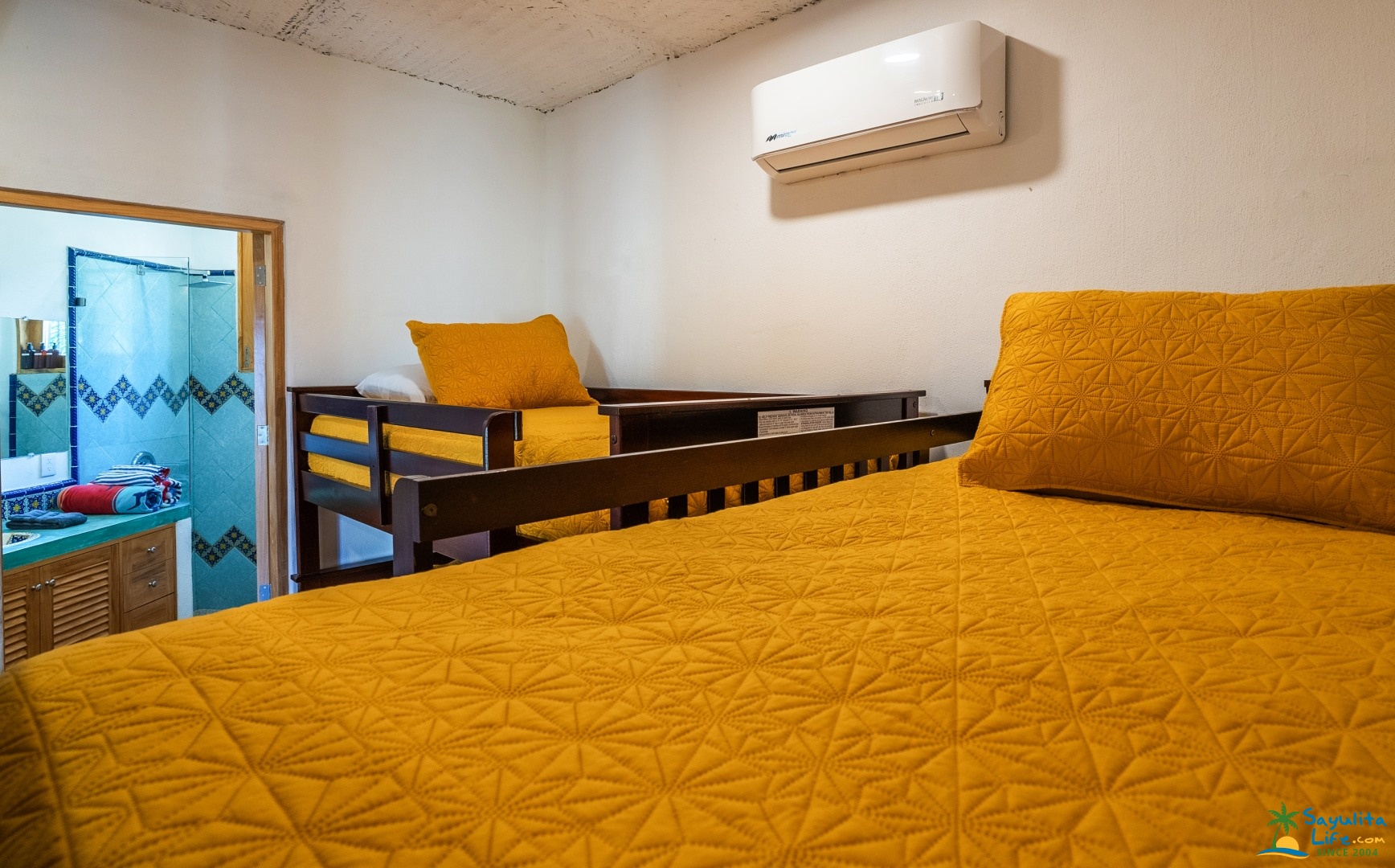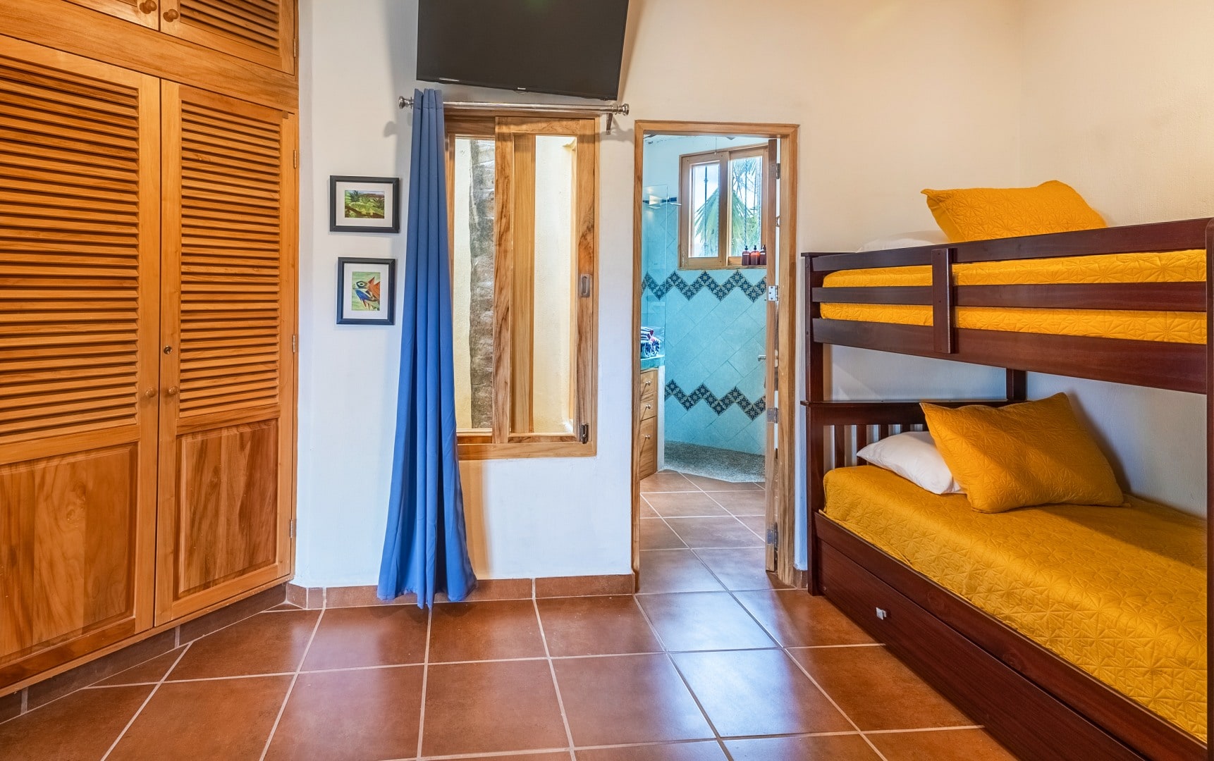♛ Bedroom 4 has two full-sized bunk beds (one with a trundle bed to sleep 5), an ensuite bathroom with a walk-in shower, interior windows into the palm tree well, and glass doors leading to the light-filled hall. Although intended as a kid’s bunk room, the beds can be used by adults as well.