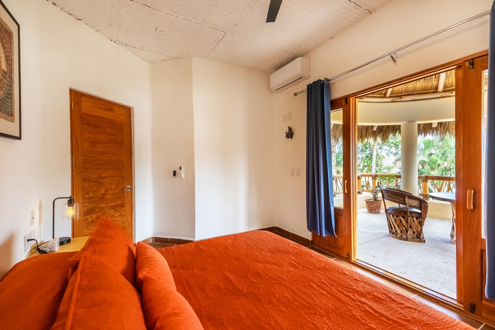 ♛ Bedroom 1 has a king-size bed, an ensuite bathroom with a walk-in shower and lots of closet storage, and a huge palapa terrace with ocean and mountain views.