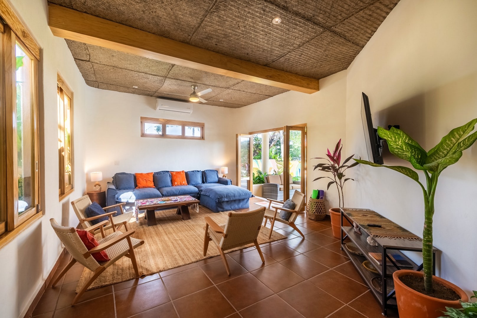 The large living room is a great place to relax, do yoga, watch the kids play in the pool, or watch a game or movie on the wall-mounted TV. The plush couch is perfect for naps and lounging and with views of the pool through the expansive doors that open to the garden.