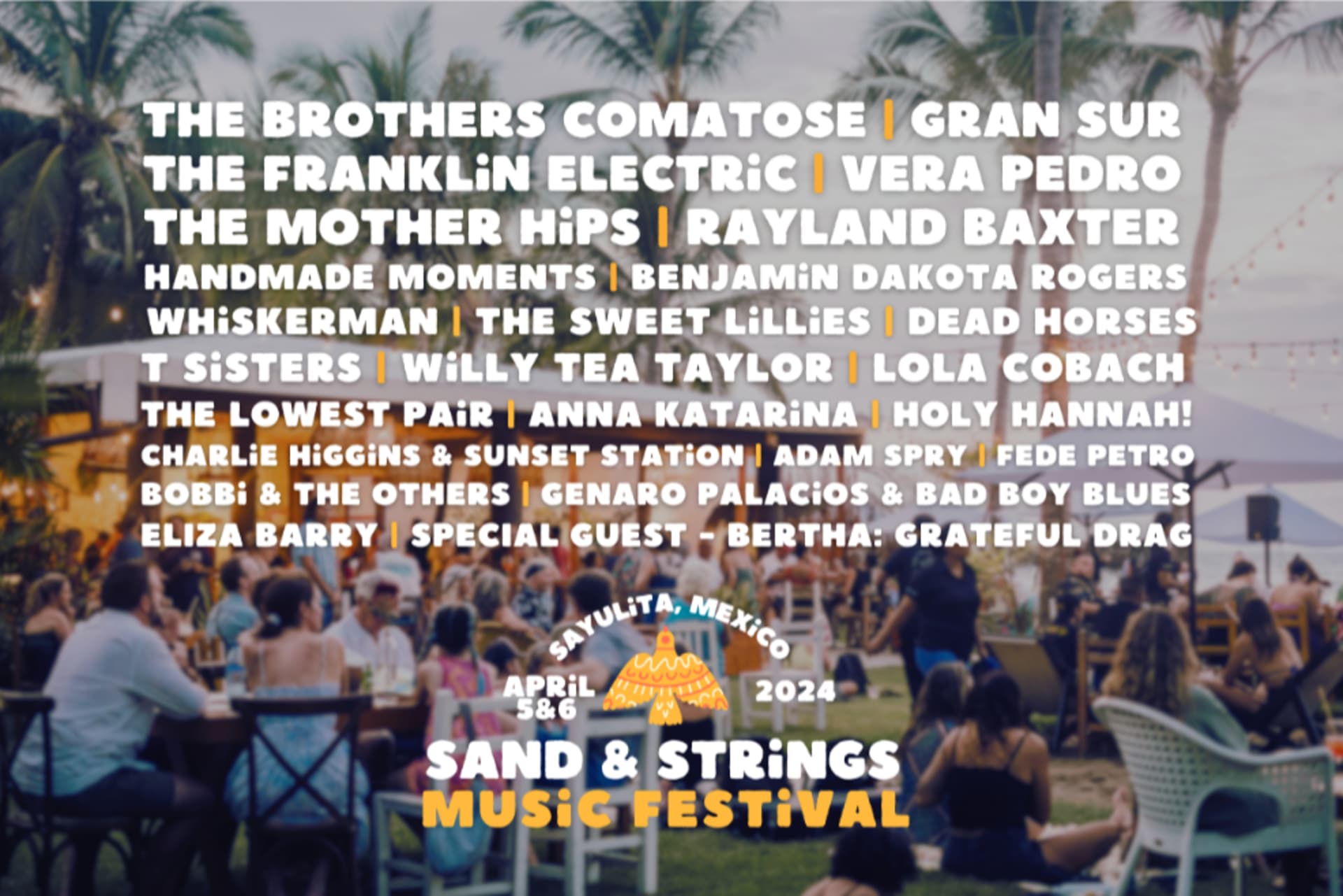 By now you have probably seen posters around town or heard through the grapevine about Sand & Strings Music Festival, which will take place April 5th and 6th at Frente al Punto Beach Club. The first (of hopefully many) edition of this gathering will feature an incredible lineup of Americana, bluegrass, indie folk and blues artists from San Francisco to Mexico City, British Columbia to Nashville, and even Sayulita and the surrounding area. The list of artists is a “who’s who” of this vibrant music scene that is rooted in tradition but firmly situated in the present: The Brothers Comatose, Rayland Baxter, The Mother Hips, The Franklin Electric, Gran Sur, The Sweet Lillies, Dead Horses, Handmade Moments, Benjamin Dakota Rogers, Sisters, Willy Tea Taylor and Vera Pedro, just to name a few.