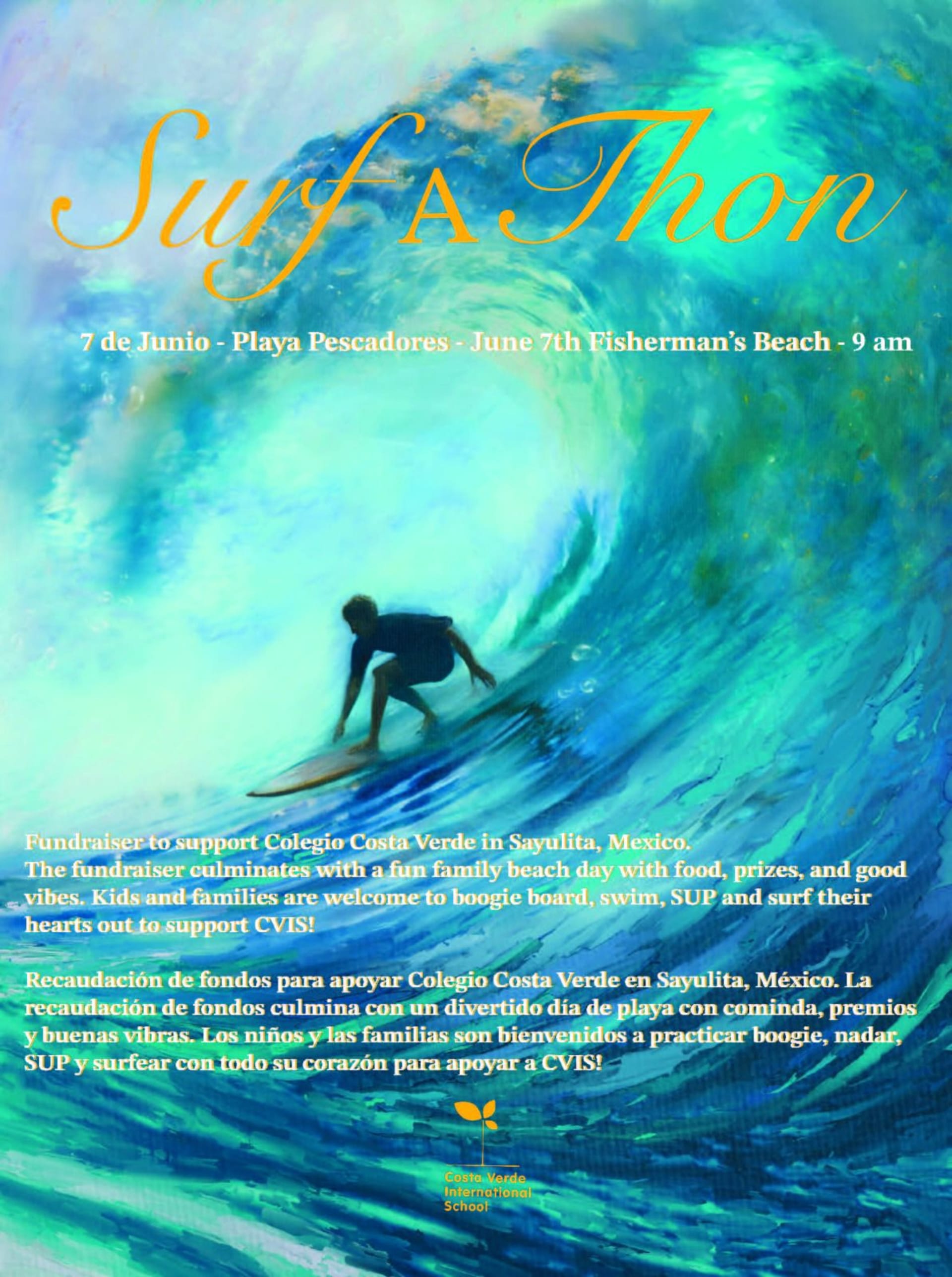 Recaudación de fondos para apoyar Colegio Costa Verde en Sayulita, México. La recaudación de fondos culmina con un divertido día de playa con cominda, premios y buenas vibras. ¡Los niños y las familias son bienvenidos a practicar boogie, nadar, SUP y surfear con todo su corazón para apoyar a CVIS!