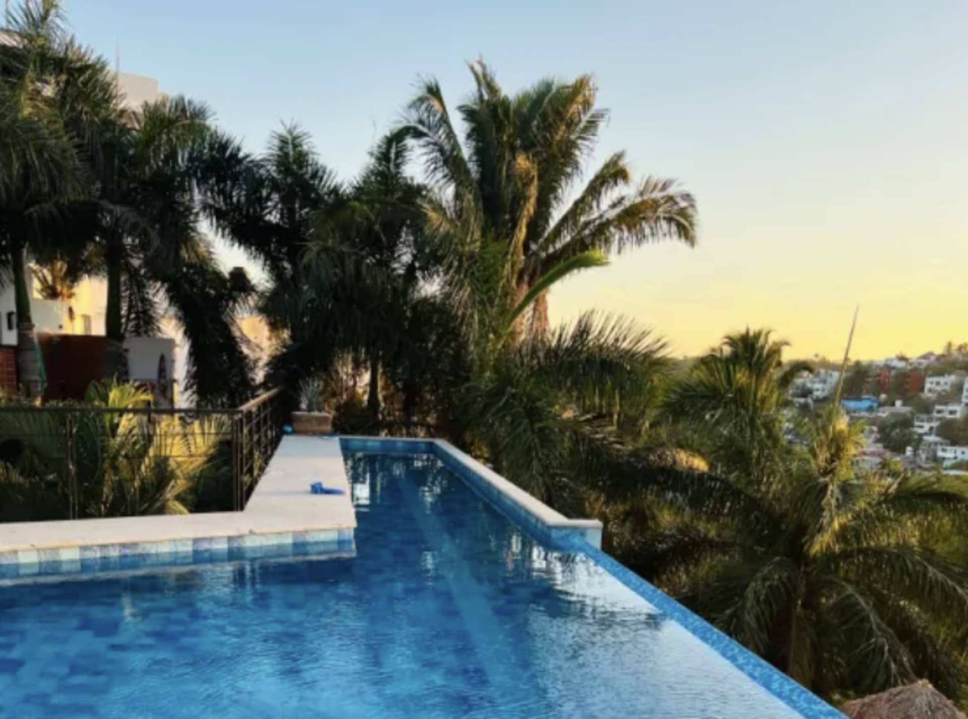 Our house is simple, mostly open-air except for the bedrooms, and nestled high among the palm trees we planted years ago. It feels like living in a treehouse, with birds flying by and the ocean breeze swishing through the fronds. In 2010, we remodeled the kitchen and powder room, and this year, we updated three bathrooms and added mini-split air conditioners to each bedroom. In 2023, we replaced our small, failing pool with a larger, elevated one, complete with a lap lane. The new patio beside the pool offers a spectacular view of the town and bay. The saltwater pool is heated during the winter, and we’ve also installed solar panels to take advantage of Sayulita’s wonderful climate.