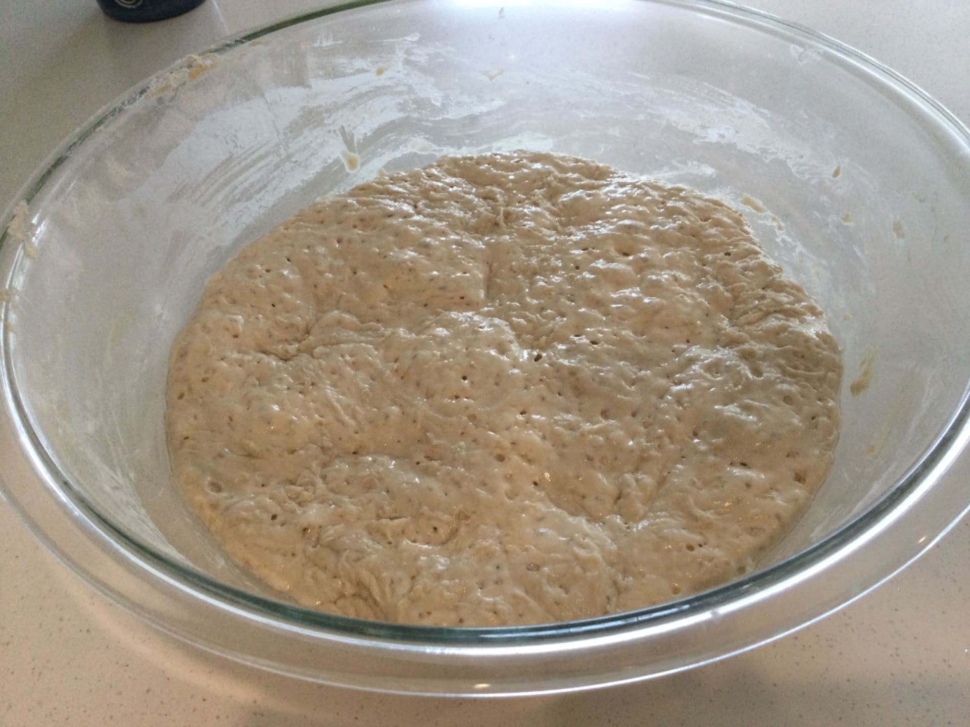 Cover the bowl tightly with plastic wrap & LET RISE for 18-24 hours. I usually prepare this in the morning and let it sit OVERNIGHT on the counter. It will look very bubbly.