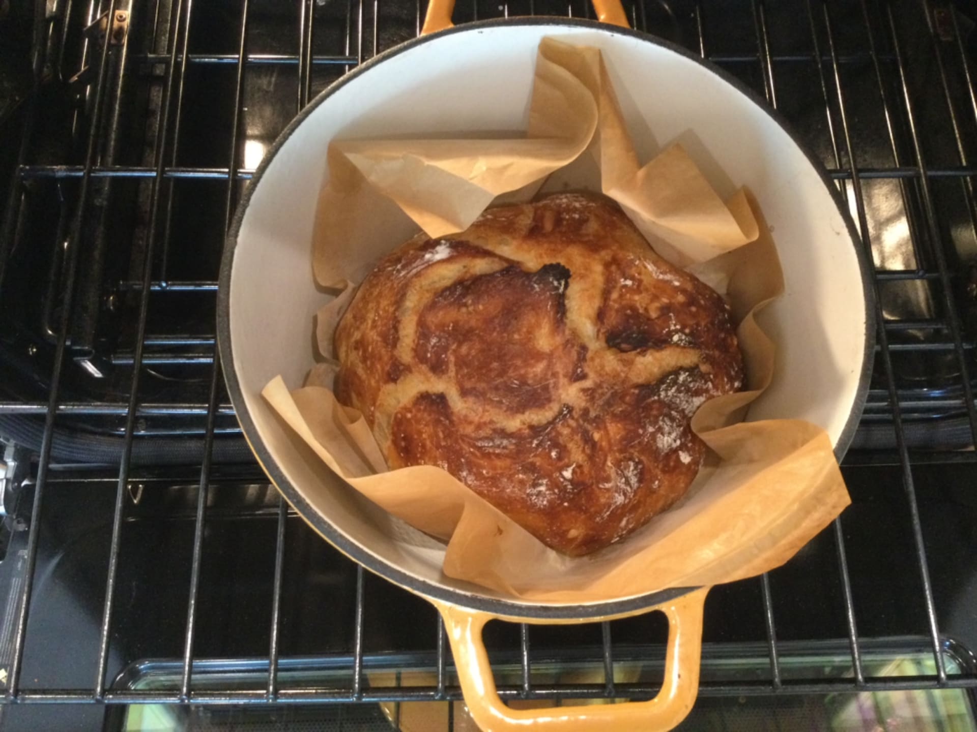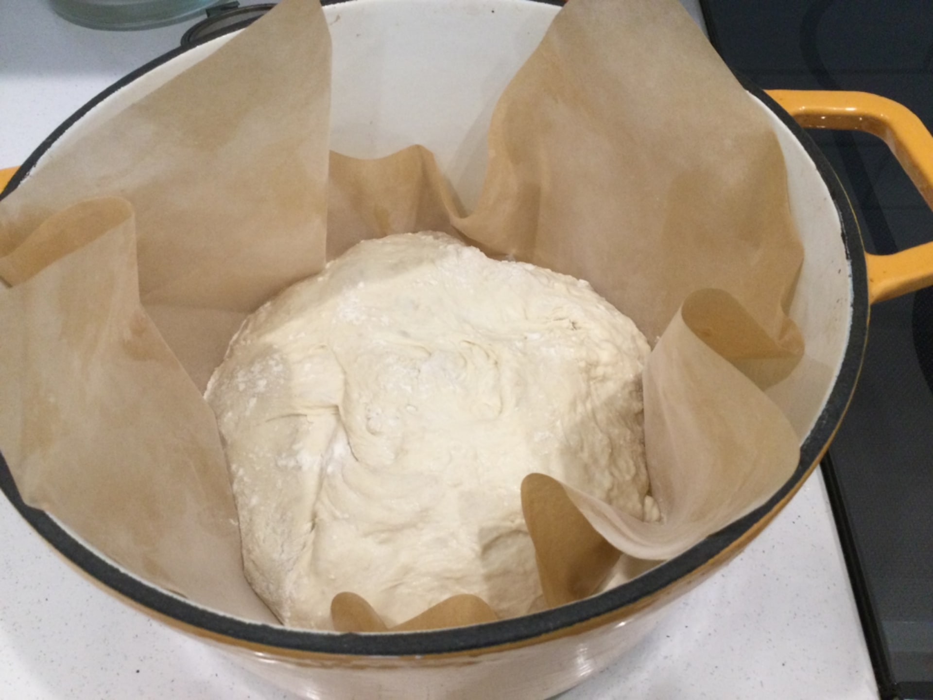 VERY CAREFULLY, use oven mitts to remove the Dutch oven. It will be extremely HOT. Lift the edges of the parchment paper to gently transfer the dough ball on the parchment paper to the hot Dutch oven. Cover with the lid and bake for 30 minutes.