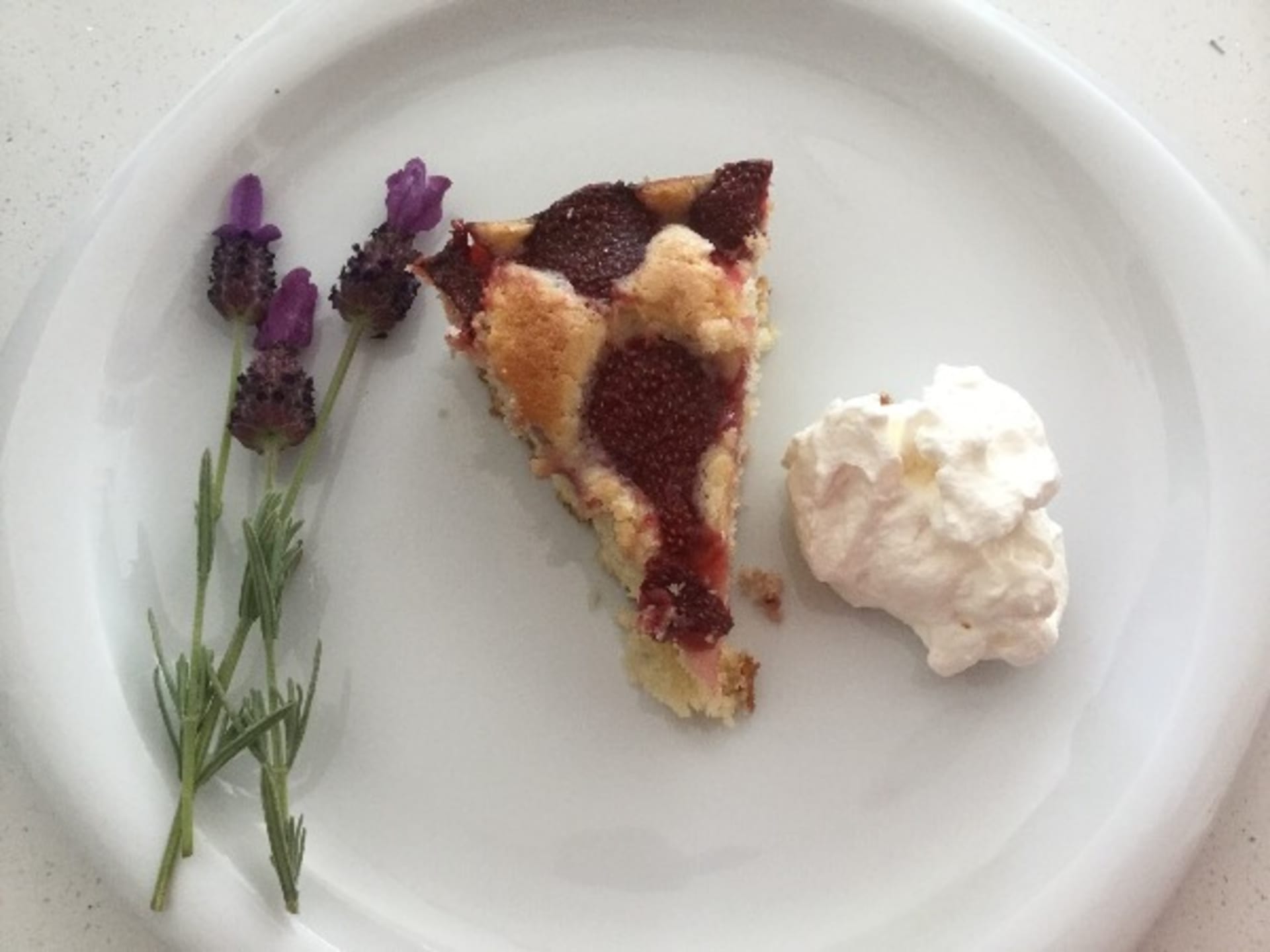 - Arrange the strawberries on top with the cut side down, so that they completely cover the batter.