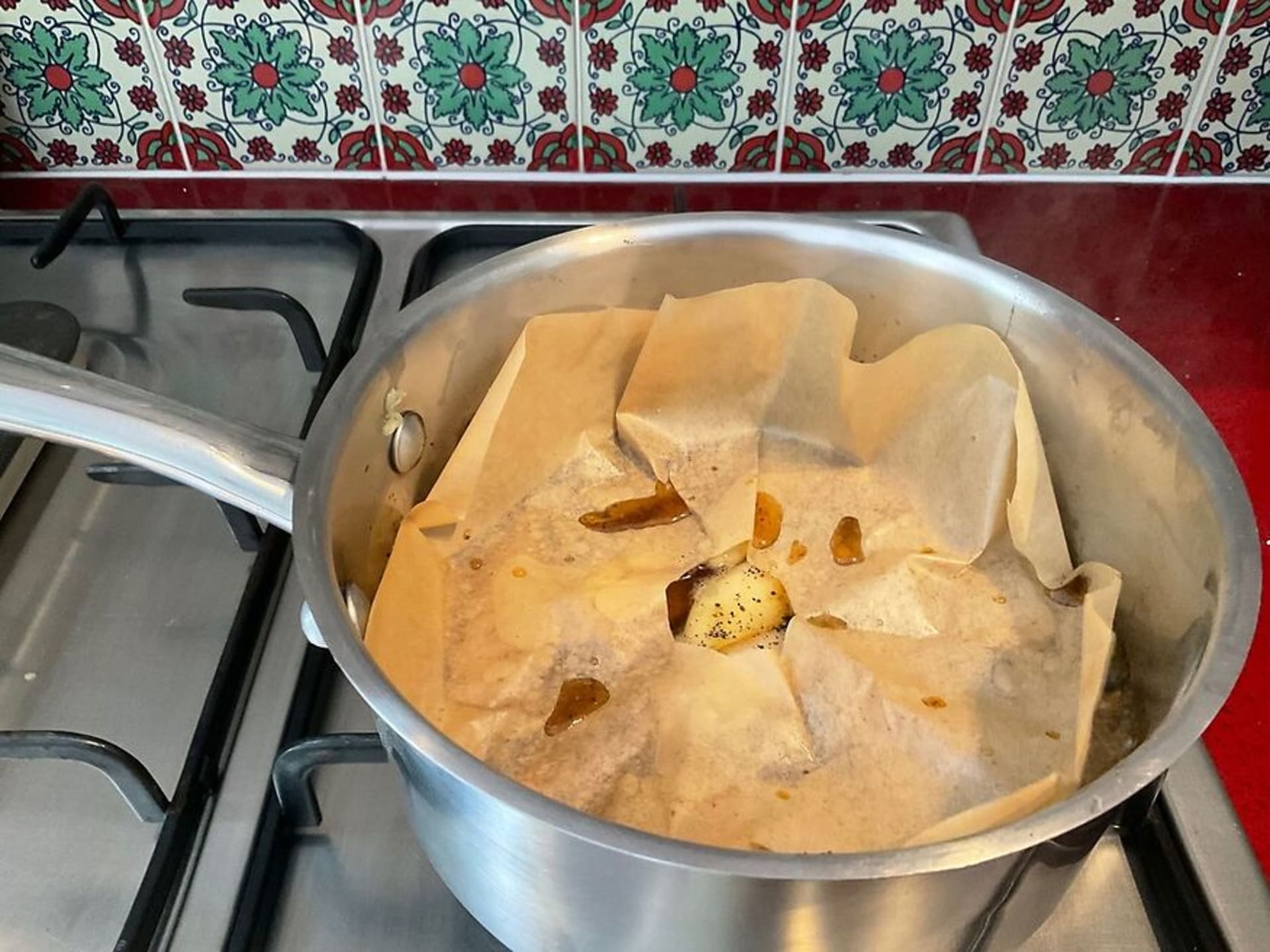 To pouch the pears evenly, ensure they remain submerged in poaching liquid by folding a circle or square of parchment paper into a triangle. With the point of the triangle at the center of the saucepan, trim the excess paper so that it fits snugly over the fruit. Cut a hole in the center for the steam to escape, and lay the prepared paper over pears with poaching liquid.