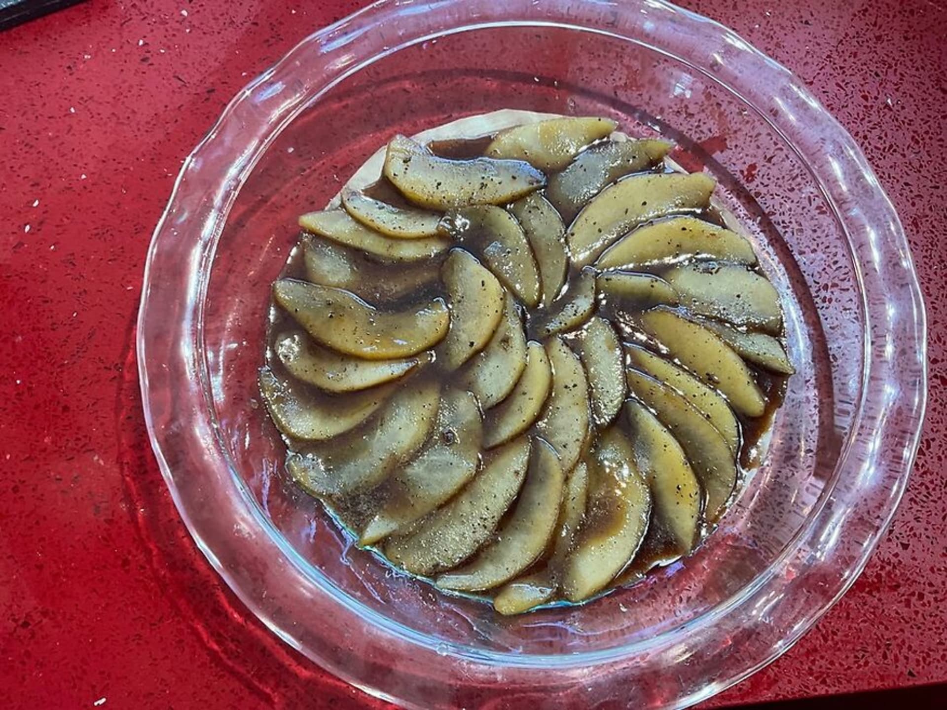 3. Arrange the pear slices on top of the syrup, placing them tight together.