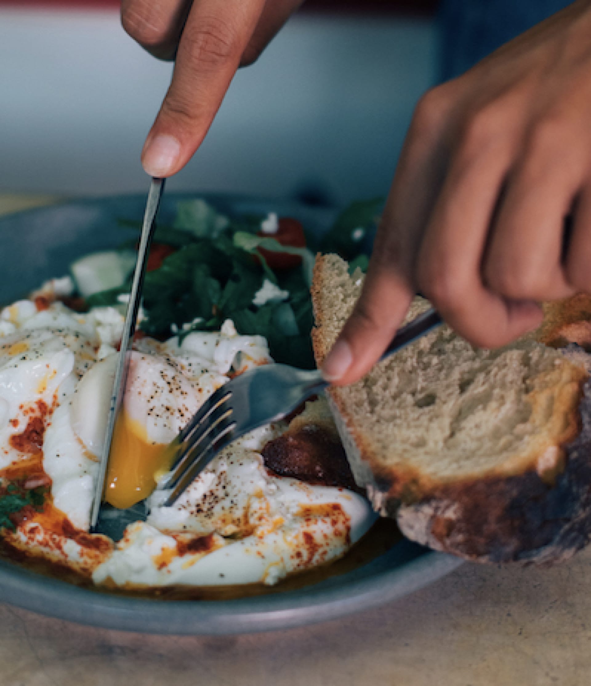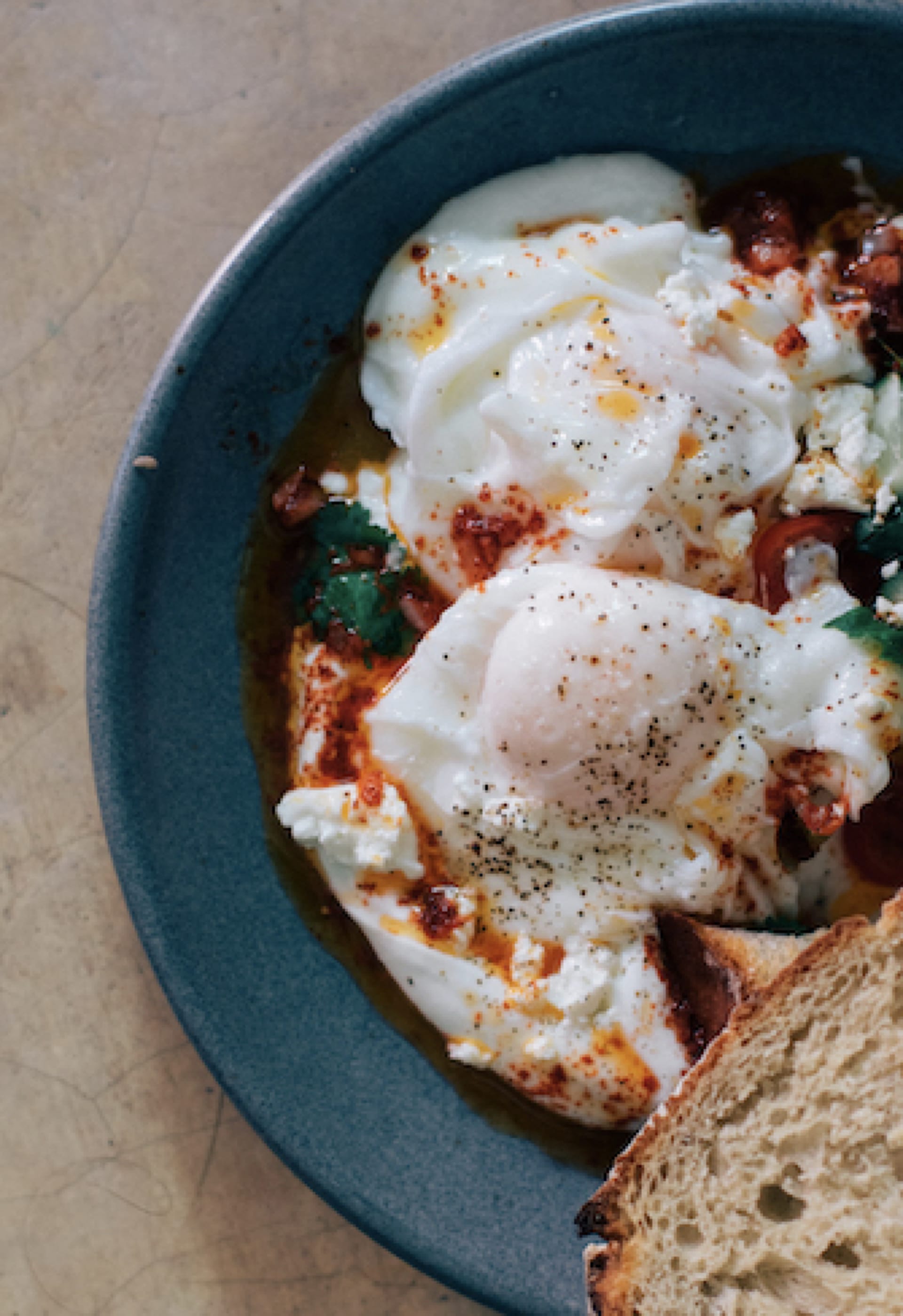 Picture this, a creamy dollop of labneh/yogurt, two perfectly poached eggs, drizzled (heavily) with chili garlic butter, topped with herby za’atar, optional goats cheese, salt, and pepper accompanied by some warm toasted bread. Voila!