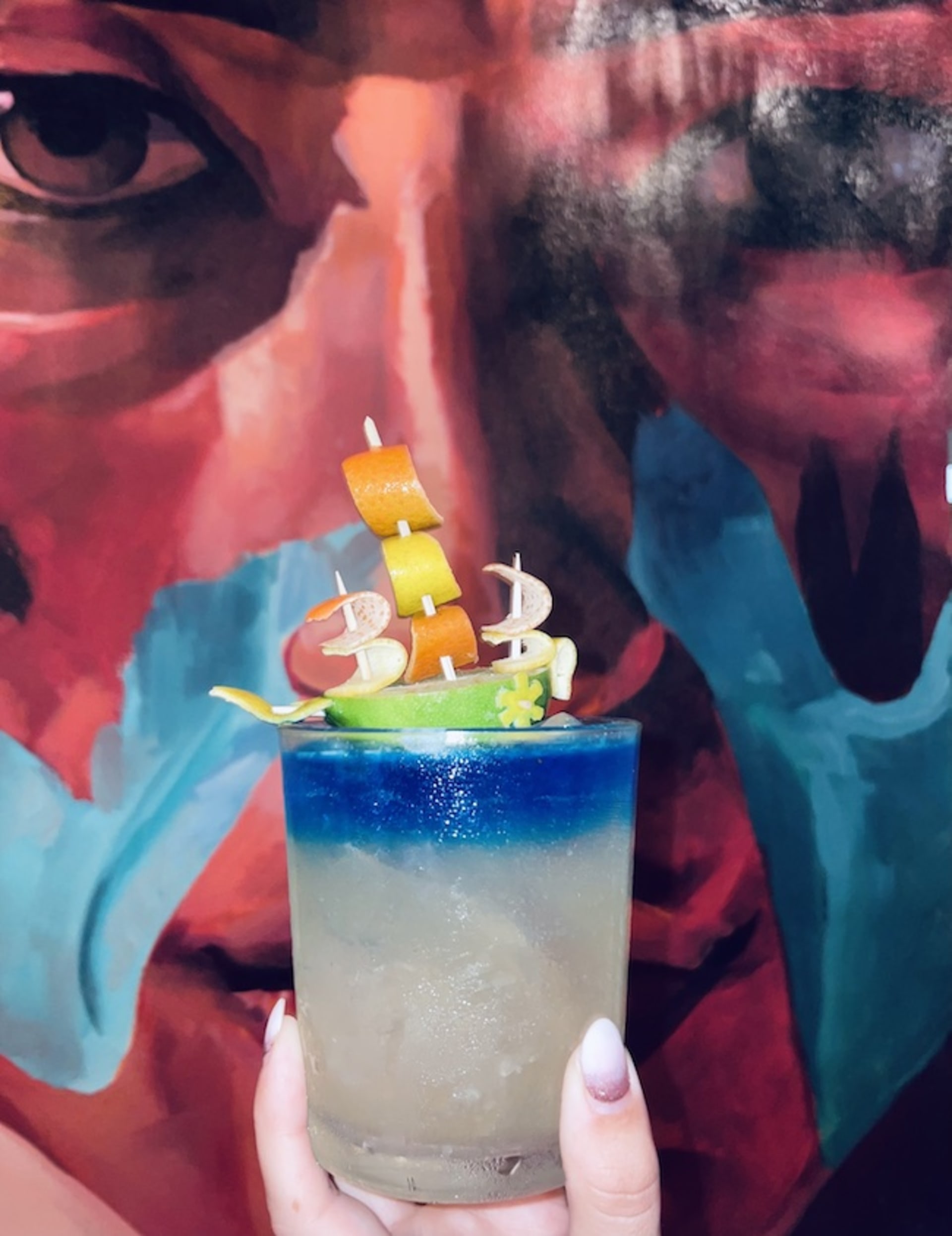 The next cocktail had the most fascinating blue color on the top, and cloudy lemon bottom half, it was topped with what can only be described as a lime pirate ship. The attention to detail on this “pirate ship” was immaculate!