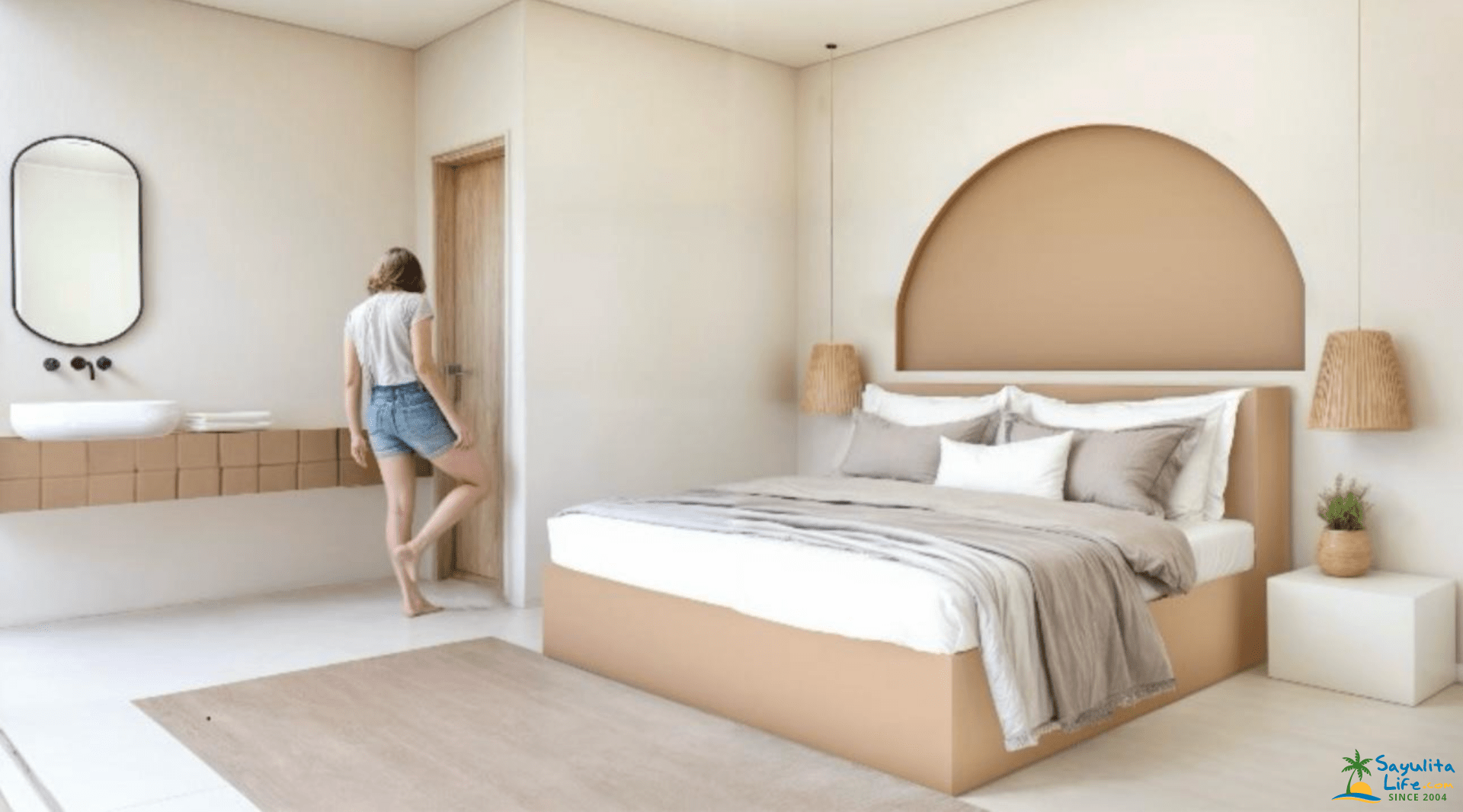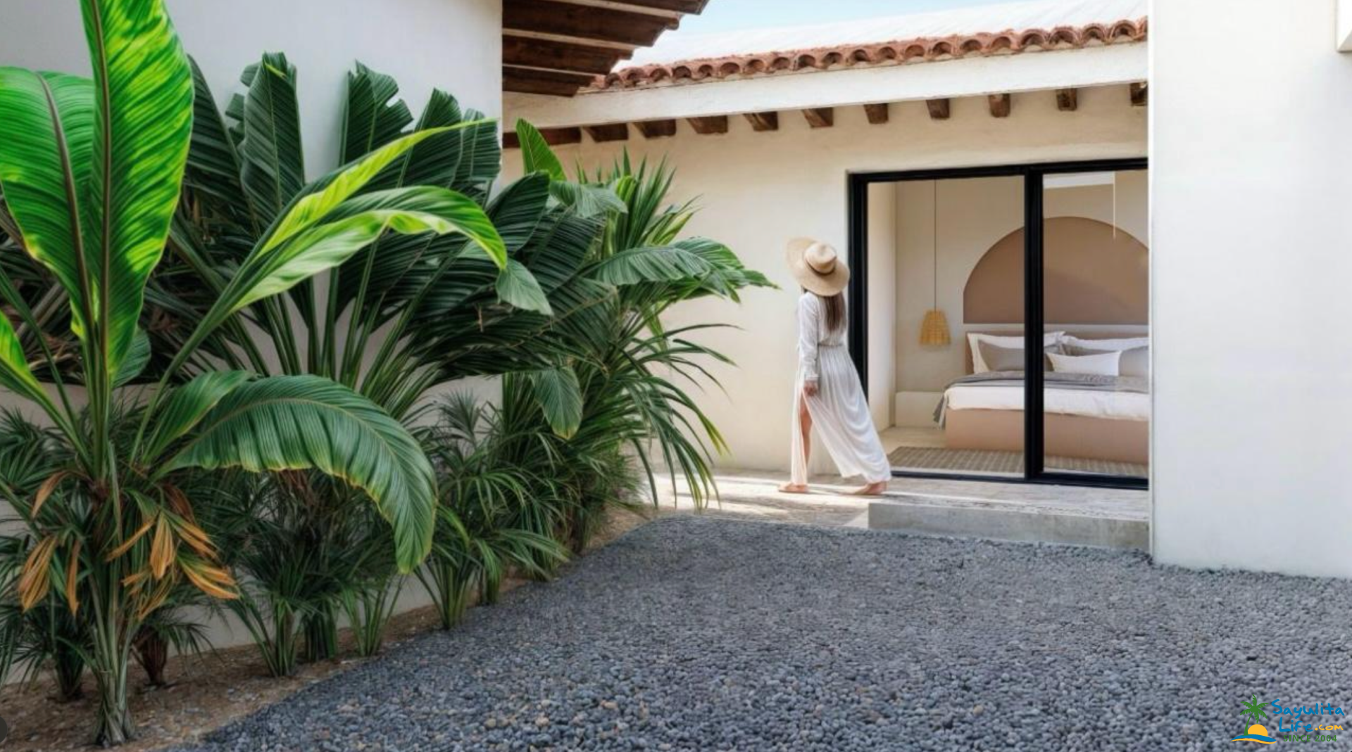 All bedrooms are separate structures with their own exterior entrances and bathrooms for added privacy. The studio bedroom is located on the floor above the kitchen, living room and dining area. The two casitas are on the other side of the pool.