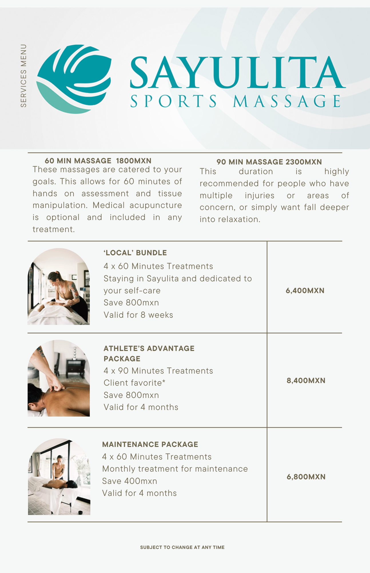 Sign In Create free accountSayulita Sports Massage is aimed at providing pain relief and relaxation through various massage techniques and medical acupuncture to get you back on the move, back to your sport, or simply enjoying your vacation pain-free!