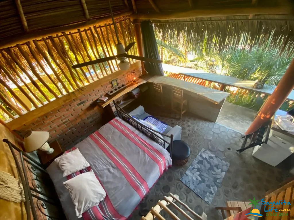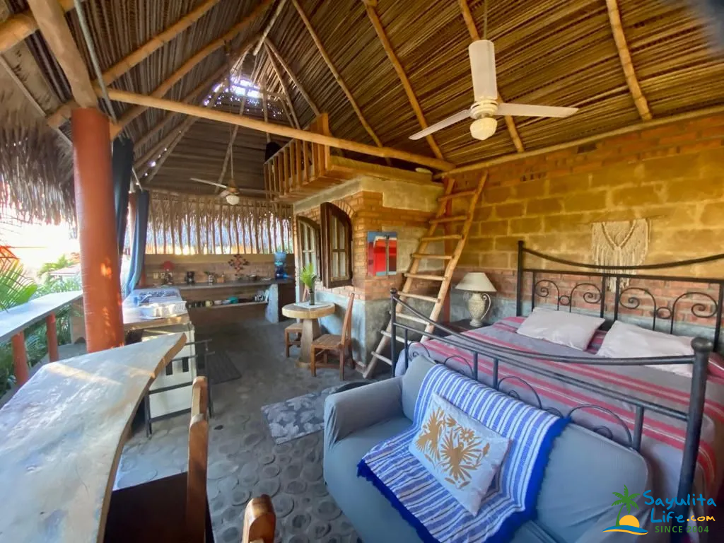 The entrance opens into a spacious main living area that includes a fully equipped kitchen, a full bathroom, and a cozy bedroom. A second loft bed, accessed by ladder, adds a playful and functional sleeping space—perfect for guests who enjoy a bit of adventure. The tall thatch roof and ceiling fans keep the space naturally cool, while the open-air design invites in light, fresh air, and the soothing sounds of nature.